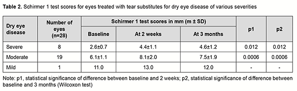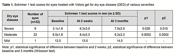 Introduction In recent years, there have been numerous studies on various aspects of dry eye disease (DED) [1-6]. However, no study has been conducted on the etiopathogenesis of DED associated with severe sequelae of burns to the eye. Therefore, investigation of the pathogenesis of DED in corneal and conjunctival cicatrization secondary to severe burns to the eye as well as optimization of the management of this condition is an important task of clinical ophthalmology. We conducted a study on the efficacy of tear substitutes and Vidisic® gel for patients with corneal and conjunctival cicatrization secondary to severe burns to the eye. The purpose of this work was to optimize the management of DED in corneal and conjunctival cicatrization secondary to severe burns to the eye on the basis of tear production studies. Material and Methods Forty patients (60 eyes) with DED and corneal and conjunctival cicatrization secondary to severe burns to the eye and showing various reductions in Schirmer test 1 scores were included in the study. Schirmer 1 test was used to assess tear production. At baseline, of the 60 eyes, 17 (28.3%) had severe dry eye (0 to 5 mm of wetting in 5 min), 41 (68.3%) moderate dry eye (6 to 10 mm of wetting in 5 min), and 2 (3.4%) mild dry eye (11 to 15 mm of wetting in 5 min). Tear substitutes (Tear Naturale; Alcon, Fort Worth, TX) or Vidisic® gel (Mann Pharma, Berlin, Germany) were administered four times a day for eyes with mild or moderate dry eye, and six times a day for eyes with severe dry eye, and tear production was assessed at 2 weeks and at 3 months. The control group involved 12 patients (15 eyes) with DED and corneal and conjunctival cicatrization secondary to severe burns to the eye who received topical normal saline. The study followed the ethical standards stated in the Declaration of Helsinki, the European Convention on Human Rights and Biomedicine and relevant laws of Ukraine. Statistical analyses were conducted using Statistica 8.0 (StatSoft, Tulsa, OK, USA) software. Quantitative data are presented as mean and standard deviation (SD). The Wilcoxon t-test was used for statistical analysis. The level of significance p ≤ 0.05 was assumed. Results The results of the study are presented in tables 1 and 2.