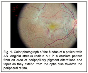 Angioid streaks (AS) are a disease of the fundus characterized by cracks in the thickened, calcified and abnormally brittle collagenous and elastic layers of the Bruch's membrane. They were first described by Doyne in 1989 as irregular radiating lines extending from the optic disc to the peripheral retina found in eyes with peripheral hemorrhages after blunt trauma [1]. In 1892, Knapp was the first to coin the term “angioid streaks” because they can closely resemble blood vessels [2]. Not until 1917 did Kofler correctly determine that angioid streaks represented changes at the level of Bruch's membrane [3]. Clinical examination with subsequent histopathological findings by Bock [4] in 1938 in two patients with pseudoxanthoma elasticum confirmed that the underlying abnormality was not vascular in nature but rather a structural alteration in Bruch’s membrane. A few years later similar histopathological results were found in patients suffering pseudoxanthoma elasticum, Paget’s disease, but also from systemic diseases [5]. Etiology and epidemiology As much as 50% of all cases occur idiopathically [6]. Angioid streaks may be found most often in pseudoxanthoma elasticum (PXE or Grönblad–Strandberg syndrome) which is characterized by progressive calcification and degeneration of elastic fibers. The name comes from Ester Elisabeth Grönblad (1898-1942), a Swedish ophthalmologist, and James V Victor Strandberg (1883-1942), a Swedish dermatologist who discussed the association between eye and skin findings in PXE [7]. The frequency of AS in patients with PXE varies between 59% and 87%, based on whether the pseudoxanthoma was diagnosed clinically or with skin biopsy. Practically all PXE patients will have developed angioid streaks 20 years after first diagnosis [8]. Other associations of angioid streaks include [8, 9]: ● Ehlers Danlos syndrome ● Marfan syndrome ● Paget's disease of bone- Angioid streaks are noted in up to 10% of cases. ● Sickle cell disease- Angioid streak is noted in around 1-2% cases, usually after the 3rd decade. Angioid streaks have been reported in sickle cell trait, homozygous sickle cell disease, sickle cell-thalassemia, and sickle cell hemoglobin C disease. ● Other hemoglobinopathies- acquired hemolytic anemia, hereditary spherocytosis, beta thalassemia major, beta thalassemia minor, beta thalassemia intermedia, hemoglobin H disease, and congenital dyserythropoietic anemia type 1. ● Acromegaly, ● Hemochromatosis ● Diabetes mellitus, ● Sturge Weber syndrome with facial angiomatosis, ● Myopia ● Hyperphosphatemia ● Neurofibromatosis ● Hypercalcemia ● Abetalipoproteinemia ● Familial polyposis of the colon ● Congenital hypertrophy of retinal pigment epithelium ● Diffuse lipomatosis ● Cutaneous calcinosis ● Microsomia ●Trauma ● Hypertensive coronary disease ●Senile elastosis ●Epilepsy Some authors, however, noted that angioid streaks are not a common feature of Ehlers Danlos syndrome, and have questioned the association of the two conditions [10, 11]. The exact prevalence of PXE is unknown, but estimates of 1:20,000 to 1: 100,000 live births have been quoted. That is, estimates suggesting that the global prevalence is 1 in 50,000 would imply that there could be as many as 150,000 patients affected with PXE worldwide. Even this number may be an underestimate, since PXE, like many genetic conditions, has variable expressivity and its milder forms often remain undiagnosed for years or even for the lifetime [6, 12]. PXE has been suggested to be more severe in women, and female/male incidence rate was reported as 2:1[13]. The inheritance of PXE is autosomal recessive and the causative mutation for PXE has been localized to the ABCC6 gene transporter protein on chromosome 16. Mutations in the ABCC6 gene lead to reduction or absence of the transmembrane transport ADP dependent protein (MRP6), causing an accumulation of extracellular material [6, 14]. The ABCC6 gene in patients with AS was scanned for putative mutations by single-strand conformation polymorphism technique, and a specific base substitution of c.G3803A was identified in exon 27, resulting in a change in codon from CGG to CAG (p.R1268Q). The authors concluded that the missense mutation p.R1268Q is associated with the disease state of AS [15]. Subsequent examination of a cohort of 54 Japanese patients with AS, identified six mutations (p.R419Q, p.E422K, c.2542delG, Del_exon23, c.3774-3775insC, and p.E1427K) as causal mutations for this eye disease [16]. Кatagiri and colleagues [17] concluded that the results of their study indicated that ABCC6 variants play a significant role in patients with AS in the Japanese population. They found four variants (p.V848CfsX83, p.Q378X, p.R1357W and p.R419Q) to be significantly associated with AS, and their findings suggested that the ABCC6 variant spectrum differs between Asian and European populations. They also concluded that AS are a hereditary retinal disorder, although the inheritance pattern has not yet been fully elucidated [17]. Pathogenesis and histology The pathogenesis of AS, especially in patients with pseudoxanthoma elasticum (PXE), is based on mineralization of the elastin-rich Bruch's membrane due to the absence of systemic antimineralization factor(s), which leads to calcification of elastic fiber-rich connective tissues, particularly, those of the membrane. The condition can result in rupture of blood vessels, leading to further deterioration of the visual function. Pathogenetically, the development of AS is believed to be as follows. The early stages are characterized by BM thickening and/or reduction in pigment granule size, and redistribution of pigment in the retinal pigment epithelium (RPE). These abnormalities may be accompanied by changes in the above-lying retinal layers and underlying choroidal capillary layer. Subsequently, the disease can progress to the development of subretinal neovascular membrane (SNM