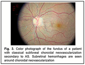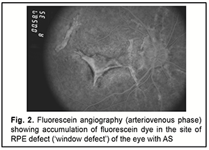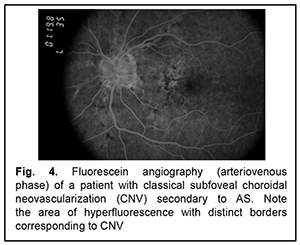 Early fluorescence and accumulation of fluorescein dye in the site of RPE defect (‘window defect’) are usually seen on FA of eyes with AS. Fluorescein leakage is evident when CNV (Figs 3, 4) is present [35].