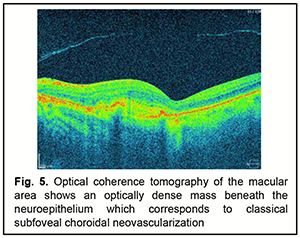 On fundus autofluorescence imaging, AS appear as hypoautofluorescent fissures, sometimes showing expansion of the hypoautofluorescence suggestive of RPE absence or atrophy. Drusen of the optic nerve are frequently associated with AS and appear as autofluorescent bodies [36]. Abnormalities of the RPE-photoreceptor complex detected by FAF imaging were more diverse and widespread than those found by fundoscopy or FA [37]. The angioid streaks having adjacent RPE alterations appear brick red, and infrared imaging showed them as well-demarcated dark fissures, even when these passed unnoticed on funduscopy [38]. Indocyanine green angiography (ICGA) can be helpful in some rare cases when ophthalmoscopy and FA cannot confirm the diagnosis of AS. Such occasions involve the severe lesions of RPE which cause hyperfluorescent lines that are obscure or the development of macular CNV; in these cases ICGA demonstrates the neovascular membrane more clearly than FA. ICGA shows hyperfluorescent lines with ‘pinpoints’ over their whole length that are larger and more numerous than those on fluorescein angiography or red-free photography. On the contrary, recently developed angioid streaks become evident only at the late stage of the examination and have the appearance of hypofluorescent linear distortions around optic nerve head or posterior pole. Although Lafaut and colleagues [39] concluded that ICGA outlined angioid streaks better than FA in the majority of cases, and occult choroidal neovascularization was better defined by ICGA, in their study, 18% of funduscopically visible streaks could not be visualized by ICGA. OCT is a current non-invasive method for diagnoisis of various fundus disorders [40, 41]. In a study by Marchese and colleagues [42], Bruch’s membrane undulations, mostly observed around the optic nerve head, were found in 19 (59.4%) of 32 eyes with AS. In addition, evolution of BM undulations into Bruch’s membrane breaks was observed in 5 eyes (15.6%). Moreover, CNV was observed in 12 eyes (37.5%) during follow-up, typically in areas of Bruch’s membrane interruption (Fig. 5).