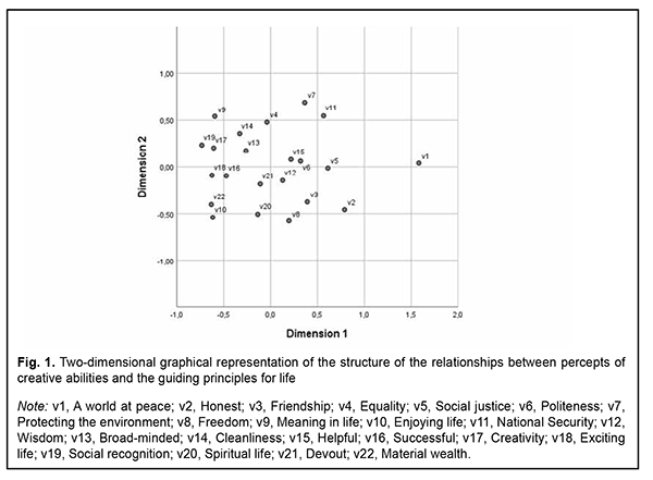 Our psychosemantic analysis of eye care workers’ percepts of creative abilities was based on the understanding of psychosemantics as a science of the language of thought, which was initially formulated by Fodor [20]. Fodor believed that the language of thought is a way of thought which is specific and innate for the human being and which the latter uses unconsciously. Semantics for the language of thought is assigned by the postulates of meanings which do not depend on lexicon and are articulated according to the logic of mental representations (percepts, beliefs, desires, etc.). Our attempt to consider the logic of the structure of percepts of creative abilities is based on the investigation of multidimensional relationships between the parameters of the Guiding Principles for Life Questionnaire; this investigation is considered below. The relationships were assessed using the statistical procedure of multidimensional scaling. Multidimensional scaling graphically represents stumuli (of objects) as points in a space of the lowest possible dimensionality [21]. The Minkowski distance is a generalisation of the ordinary Euclidean distance and the Manhattan distance [22] and we used it as a similarity measure for multidimensional scaling. The Minkowski distance is a more promising solution for building space models than other distance metrics [23]. The space model built through multidimensional scaling was assessed using the following criteria: Normalized Raw Stress (NRS), Dispersion Accounted For (DAF), and Tucker’s Coefficient of Congruence (TCC) [24]. Fig. 1 shows a two-dimensional graphical representation of the structure of the relationships between percepts of creative abilities and the guiding principles for life. The values of model fit indices were found to be adequate (NRS = 0.030; DAF = 0.970; TCC = 0.985), which allowed making conclusions on the basis of this model.