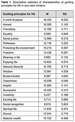 http://doi.org/10.31288/oftalmolzh202134148 Received: 01 April 2021; Published on-line: 29 June 2021 Psychosemantic analysis of eye care workers’ percepts of creative abilities N. V. Rodina 1, B. V. Biron, V. O. Suslova 1, A. V. Kernos 2, O. S. Grytsenko 1 1 Odesa Mechnikov National University; Odesa (Ukraine) 2 Odessa National Maritime University; Odesa (Ukraine) E-mail: nvrodinaod@gmail.com TO CITE THIS ARTICLE:Rodina NV, Biron BV, Suslova VO, Kernos AV, Grytsenko OS. Psychosemantic analysis of eye care workers’ percepts of creative abilities. J.ophthalmol.(Ukraine).2021;3:41-48. http://doi.org/10.31288/oftalmolzh202134148 Background: This article puts the emphasis on the notion of “creative abilities” in the context of its interpretation by eye care workers. Creative potential is essential for the general and professional culture of physicians, and personal creativity takes on a new meaning in the age of digitalization and dominance of artificial intelligence in routine medical practice. Purpose: To investigate eye care workers’ percepts of creative abilities by conducting a psychosemantic analysis and considering these percepts as a source of health care workers’ job satisfaction. Material and Methods: The study sample was composed of the eye care workers from the Filatov Institute of Eye Diseases. Two hundred and eleven eye care workers were requested to take part in the study, and the response rate was 85.8% (181/211). The 181 responders included 99 nursing staff members and 82 physicians (ophthalmologists). The study was conducted with the use of Hughes and Powell’s Guiding Principles for Life (GPL) Questionnaire (adapted by Semeniuk), the Kim, Leong, and Lee’s Job Satisfaction Scale (JSS) (adapted by Semeniuk) and the Lüscher 8-color test. Results: Eye care workers rated “Creativity” low among the 22 “Guiding Principles for Life”. In physicians, such guiding principles as “Creativity”, “Devout”, and “Material wealth” were associated with each other, which indicates that the achievement of material wealth was associated with such a virtue as devout, and this achievement requires creativity. It was demonstrated that creativity as a guiding principle was more important for physicians than for the nursing staff, and in male physicians it was associated with unconscious satisfaction with working environment. Keywords: psychosemantic analysis, percept, creativity, job satisfaction, ophthalmologists Conflict of Interest Statement: The authors declare no conflict of interest which could influence their opinions on the subject or the materials presented in the manuscript. Introduction The importance of creative abilities in the activities of medical professionals is increasingly topical and highlighted in a number of studies. Most of these studies are devoted to the development of creative abilities in medical students [1-4], particularly those studying ophthalmology [5]. The articles on medicine of the future stress that, in the 21st century, medical professionals will be required to demonstrate creative abilities in developing novel promising treatments and show creative imagination in diagnostics [6]. Attitudes to the role of creative abilities in the activities of medical professionals have been studied among the healthcare workers involved in various medical specialties like family medicine, therapy, obstetrics and gynecology, pediatrics, psychiatry, surgery [7] and nursing care [8]. Although there have been several reports on creative solutions to problems in eye health care [9-11], the lack of studies on the attitudes of eye care workers to creative abilities is what makes the current study important. Therefore, the purpose of this study was to investigate eye care workers’ percepts of creative abilities by conducting a psychosemantic analysis and considering these percepts as a source of health care workers’ job satisfaction. Material and Methods The study sample was composed of the eye care workers from the Filatov Institute. Two hundred and eleven eye care workers were requested to take part in the study, and the response rate was 85.8% (181/211). The 181 responders included 99 nursing staff members and 82 physicians (ophthalmologists). All nursing staff members were women, i.e., the subsample of nursing staff was composed of women only. Of 82 physicians, 38 (46.3%) and 44 (53.7%) were men and women, respectively. The Hughes and Powell’s Guiding Principles for Life (GPL) Questionnaire was used to study the attitudes of responders to the role of creative abilities in their life [12]. Twenty-two guiding principles for life (A world at peace, Honest, Friendship, Equality, Social justice, Politeness, Protecting the environment, Freedom, Meaning in life, Enjoying life, National Security, Wisdom, Broad-minded, Cleanliness, Helpful, Successful, Creativity, Exciting life, Social recognition, Spiritual life, Devout, and Material wealth) were listed, and the respondents were asked to rate them according to their importance. The principle ranked as most important was scored 22, and the least important was scored 1. We believed that the prevalence of creativity as a leading guiding principle for life among the above principles will indicate a positive attitude of respondents to the role of creative abilities in their personal life and recognition of the importance of creative abilities in professional and other activities. Hughes and Powell believed that most people affirm a wide range of values, but particular people draw more heavily on certain sets of values than others. The original version of the questionnaire was for the first time used in the Australian Community Survey. The four different value orientations (domains) found by the study included Order, Social Well-being, Spirituality and Self-enhancement. However, the principles for life these domains are composed of have been not specified in the original version of the questionnaire. Semen
