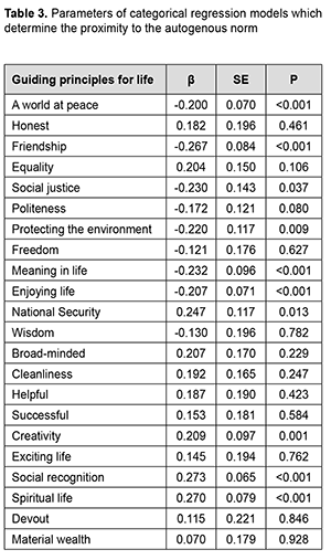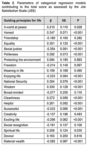 The plot demonstrates that, in the psychosemantic space of eye care workers, creative abilities are associated with such guiding principles for life as Spiritual life, Cleanliness, Successful, Social recognition, Meaning in life, and Broad-minded, and thus form a separate set of mental representations. At the second phase of the statistical analysis, we investigated the effects of the 22 guiding principles for life on job and organizational satisfaction. Since the parameters of the GPL instrument were ordinal numbers, we believed it reasonable to use the regression models which are resistant to non-normal distribution and do not depend on the type of measure scale. Correspondingly, we used categorical regression with optimal scaling. We used CATREG Version 3.0 (Leiden SPSS Group, Leiden University, the Netherlands) as an optimal scaling algorithm. This approach to non-linear regression allows stabilizing the estimates of regression coefficients and obtaining an optimal transformation of the variables [25]. Each categorical regression model included one independent variable, control variables, and one dependent variable. A guiding principle for life was used as an independent variable, social and demographic parameters like gender (female and male categories) and position (physicians and nursing staff categories) were used as control variables, and a job and organizational satisfaction characteristic was used as a dependent variable. Tables 2 and 3 present categorical regression results. Standardized regression coefficients (β), standard errors of regression coefficients (SЕ) and statistical significance (p) of regression coefficients for guiding principles for life (model predictors) were calculated.