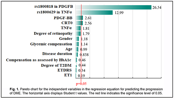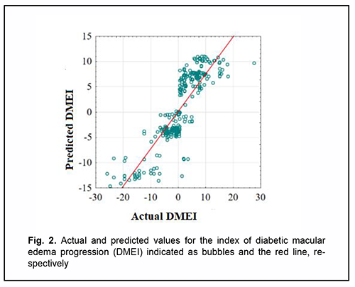 Multivariate logistic regression analysis was used to develop a model in Statistica 10 (GLZ; StatSoft, Tulsa, OK, USA). A set of independent variables for the development of regression equations was formed based on the princi-ple of availability and adequacy of the data that can be obtained in the initial period of patient observation at en-rollment in the study. These variables were as follows: age, gender, severity and duration of T2DM, degree of hy-perglycemia compensation as assessed by glucose and glycated hemoglobin (НbA1c) levels, DR stage and severity on the ETDRS scale, central retinal thickness (CRT0), blood levels of ЕТ1, TNFα, and PDGF-BB, and genotypes of PDGFB rs1800818 and TNFα rs1800629 (“101”, “102”, and “103” were used as dichotomous values for wild ho-mozygote, heterozygote, and minor homozygote, respectively). In the first phase of the development of multivari-ate regression models, significant predictors were selected from the set of independent variables based on the esti-mation of beta coefficients regarding the significance of their difference from the null hypothesis (p < 0.05).