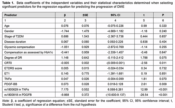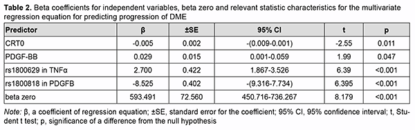 Table 1 presents beta coefficients of the independent variables and their statistical characteristics determined when selecting significant predictors for the regression equation for predicting the progression of DME.