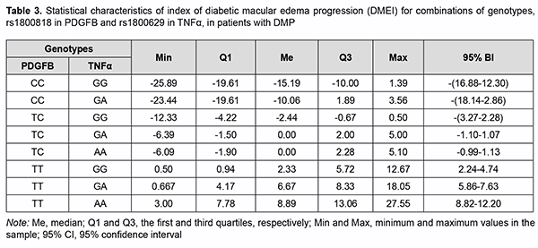 Results: Index of diabetic macular edema progression (DMEI) was used as the dependent variable and calculated as the mean speed of change in central retinal thickness (CRT) over a year after the initiation of treatment for DMP. SNP rs1800818 in PDGFB, SNP rs1800629 in TNFα, blood PDGF-BB level, and CRT0 were found to be significant predictors of the risk for postoperative DME recurrence. The calculation of DMEI values allowed to divide possible genotype combinations into three groups: those promoting the regression (СС-GG; CC-GA; TC-GG), those with a stable DMEI value (TC-GA and TC-AA), and those promoting the progression of DME.