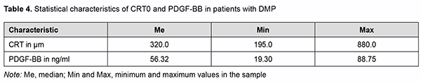 The above findings warranted the development of the system for predicting recurrence of DME after surgical treatment for DMP on the basis of biochemical markers of the pathological process [10, 11]. We believed that en-dothelial dysfunction characteristics, such as endothelin-1 (ET1), rumor necrosis factor (TNF)-α, and platelet-derived growth factor (PDGF-BB) could be used as such markers [12].