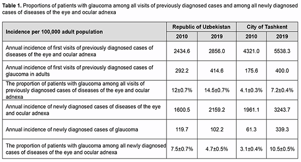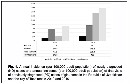 Discussion Among all patients with eye diseases, the proportion of patients with glaucoma in the world is about 12-14%. This proportion is, however, as large as 11-20% in the eastern countries like India, Yemen, China, Singapore and Syria [11-17]. Over the recent decades, in Uzbekistan and the city of Tashkent, as in many other countries, there has been a steady growth in the annual incidence of glaucoma in the adults older than 40 years. Our analysis demonstrated that, among all patients with eye diseases, the proportion of patients with glaucoma in Uzbekistan and the city of Tashkent is within the same range as in other Asian countries. Thus, in Uzbekistan and the city of Tashkent, among all patients with eye diseases, the mean proportion of patients with glaucoma for the decade was 13.2% and 5.6%, respectively, whereas the annual incidence of newly diagnosed cases of glaucoma in adults increased 1.8 times and 5.5 times, respectively (p ≤ 0.05). In addition, there was an increase in the annual incidence of first visits of previously diagnosed cases of glau-coma in adults. Thus, from 2010 through 2019, the annual incidence of first visits of previously diagnosed cases of glaucoma in adults increased 1.3 times for the country in total, and 2.3 times, for the city of Tashkent. The higher incidence of glaucoma in Tashkent compared to other regions of the country can be explained by not only better provision of eye care service, and, consequently, better detection of glaucoma process, but also by the age structure of the population, with the age group of 60 years and above representing more than 15.7% of the population for the city, compared to 10% for the total country [18]. And it is the senior age groups that constitute a major portion of patients with glaucoma [1, 2, 3, 4, 11]. It is estimated that, from 2010 through 2029, the annual incidence of newly diagnosed cases of glaucoma in adults and the annual incidence of first visits of previously diagnosed cases of glaucoma in adults in the country will increase 3.7 times and 2.5 times, respectively (p ≤ 0.05), whereas those in the city of Tashkent will increase 12.6 times and 4.9 times, respectively (p ≤ 0.05). It is likely that an increase in the incidence of glaucoma will be associated not only with an improvement in the quality and increase in the amount of eye care given, but also with an increase in the proportion of older people in the population of the republic. Thus, the proportion of people older than age 60 in the population of Uzbekistan is somewhat more than 10% currently, and will increase to 30-35% by 2030, with a current increase in life expectancy and low level of total mortality [18]. Given a high level of glaucoma-associated disability and increased risk of premature mortality due to glaucoma, the above increase in the incidence of glaucoma in the republic makes the management of the disease an important medical and social challenge for Uzbekistan, necessitating further studies, improvement in treatment quality, devel-opment of advanced methods of prevention and early detection and incorporation of these methods into clinical practice.