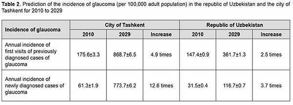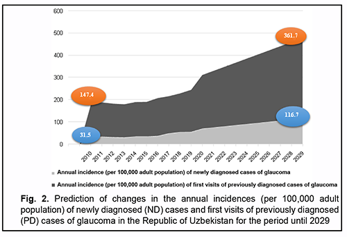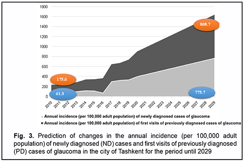 Introduction Glaucoma is not only one of the most common, but also one of the most severe chronic and progressive eye diseases. Therefore, the disease is a relevant problem in ophthalmology and a leading cause of reduced vision and irreversible blindness [1, 2, 3, 4, 5, 6]. Glaucoma is the leading cause of visual impairment and disability [7, 8, 9, 10, 11, 12]. Foreign studies have demonstrated an increase in the incidence of the disease among adults [1, 2, 3, 6, 7, 8]. It was predicted in 2006 that, globally, there would be 60.5 million people with glaucoma in 2010, increasing to 79.6 million by 2020, and over 8.4 million people would be bilaterally blind from primary glaucoma in 2010, rising to 11.1 million by 2020 [9]. Glaucoma is believed by Nesterov and others [6, 10] to be a multifactorial disease with a threshold effect and without clear etiology. In addition, early detection of glaucoma is challenging, and national incidence and disability due to glaucoma are regularly assessed in many countries [5]. Glaucoma screening is of crucial importance and allows early disease detection, which is beneficial for disease course and treatment outcomes [6, 7, 8]. There are scarce data on the incidence of glaucoma in the Republic of Uzbekistan for the recent decade, indicating a necessity for glaucoma screening in the country. Therefore, the pur-pose of this study was to assess the current incidence of glaucoma in the republic and the city of Tashkent, and predict disease incidence for the subsequent decade. Material and Methods The report of the Ministry of Health “On the numbers of diseases and registered patients residing in the primary service area of the medical facility» and national statistical collections (“Statistical materials on the activities of healthcare institutions of the Republic of Uzbekistan”) for 2010-2019 were studied to determine the incidence of glaucoma and the relevant characteristics in the republic. These materials allowed us to obtain the data on annual incidences of newly diagnosed cases and annual incidences of first visits of previously diagnosed cases of glauco-ma in adults (i.e., individuals older than age 19) in the regions of the country for 2010 to 2019 years. In addition, the retrospective analysis of the statistical reports from the ministry allowed predicting changes in the incidence of glaucoma in the adult population for the near and far future. A linear regression was used for prediction. Microsoft Excel 7.0 software was used for statistical analysis. Student t test was employed to assess difference between the groups. The level of significance p < 0.05 was assumed. Results Our analysis based on the report of the Ministry of Health “On the numbers of diseases and registered patients residing in the primary service area of the medical facility” and national statistical collections (“Statistical materials on the activities of healthcare institutions of the Republic of Uzbekistan”) for 2010-2019 found that, from 2010 through 2019, the annual incidence of newly diagnosed cases of glaucoma in adults increased 1.8 times, from 31.5 ± 0.4 to 56.1 ± 0.5 per 100,000 adult population (Р ≤ 0.05), for the country in total, and much more substantially, 5.5 times, from 61.3 ± 1.9 to 339.3 ± 4.4 per 100,000 adult population (Р ≤ 0.05), for the city of Tashkent. The annual incidence of first visits of previously diagnosed cases of glaucoma in adults also increased during this period. Thus, from 2010 through 2019, the annual incidence of first visits of previously diagnosed cases of glaucoma in adults increased 1.3 times, from 147.4 ± 0.9 to 189.2 ± 1.0 per 100,000 adult population (Р ≤ 0.05), for the country in total, and 2.3 times, from 175.6 ± 3.3 to 400.0 ± 4.7 per 100,000 adult population (Р ≤ 0.05), for the city of Tashkent. Among all patients with eye diseases, the proportion of patients with glaucoma in Uzbekistan and the city of Tashkent is within the same range as in other Asian countries. Thus, among all patients with eye diseases, the mean proportion of patients with glaucoma in Uzbekistan and the city of Tashkent for the decade was 13.2% and 5.6%, respectively (Table1). In addition, during 2010 through 2019, among all newly diagnosed cases of eye diseases de-tected annually, the proportion of patients with glaucoma in the city of Tashkent increased three times, from 3.1 ± 0.4% to 10.5 ± 0.5%, and in Uzbekistan decreased from 7.5 ± 0.7% to 4.5 ± 0.5%, and these changes were statisti-cally significant (p ≤ 0.05). However, among all newly diagnosed cases of the diseases of the eye and ocular adnexa detected annually, the proportion of patients with glaucoma in Uzbekistan increased from 12 ± 0.7% in 2010 to 14.5 ± 0.7% in 2019, and in the city of Tashkent increased from 4.1 ± 0.3% in 2010 to 7.2 ± 0.4% in 2019 (p ≤ 0.05). A linear regression equation was used to calculate the predicted changes in the annual incidence of newly diagnosed cases of glaucoma and in the annual incidence of first visits of previously diagnosed cases of glaucoma in adults in Uzbekistan and in the city of Tashkent for the period until 2029.