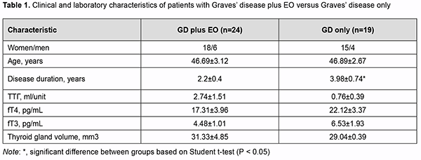 There was no significant difference in TSH, fT4 or fT3 between patients of these groups (Table 1). Thyroid gland dimensions in patients of both groups were significantly higher than normal reference values, with no signifi-cant difference between patients of both groups. Serum IL-1β levels for patients of both groups were significantly higher than for controls (р<0.05). Serum IL-1β levels for patients with GD plus EO were significantly higher than for patients with GD only (45.48 ± 16.19 versus 10.44 ± 5.17; р < 0.05). Table 2 presents serum IL-1β, IL-10, anti-thyroid peroxidase Ab, and TSHR-Ab for patients of both groups. Serum IL-10 levels for patients with GD plus EO and those with GD only (23.76±7.72 and 22.21±2.82, respec-tively) were also significantly higher than for controls (5.32±1.23). There was no significant difference in serum IL-10 or anti-thyroid peroxidase Ab levels between patients of these groups (Table 2).
