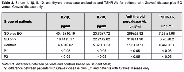 Serum TSHR-Ab for patients were higher than reference values, and serum TSHR-Ab levels for patients with GD plus EO were significantly higher than for those with GD only (7.32±1.68 unit/mL versus 3.76±0.2 unit/mL; р=0.04). These findings are in agreement with the literature, since serum TSHR-Ab is a diagnostic marker of autoimmune activity in EO. Discussion Therefore, we found significantly increased serum pro-inflammatory cytokine IL-1β and TSHR-Ab levels in pa-tients with GD plus EO compared to those with GD only (45.48±16.19 pg/ml versus 10.44±5.17 pg/ml; р<0.05). This may indicate the specificity of this characteristic as a diagnostic marker of orbital autoimmune activity. Our findings are in agreement with others who reported on the activation of orbital fibroblasts in EO, with these fibroblasts being able to secrete proinflammatory cytokines IL-1β, IL-1α, IL-6, and IL-8 to contribute to orbital inflammation [17]. IL-10 is a cytokine which not only suppresses cellular immunity but also stimulates the humoral response. The current study found significantly increased serum IL-10 levels in patients with GD plus EO and those with GD only, which was as expected accompanied by high serum TSHR-Ab levels. There was, however, no significant difference in serum IL-10 levels between patients with GD plus EO and those with GD only (23.76±7.72 pg/ml versus 22.21±2.82 pg/ml). Therefore, there was no expected response (no increase in serum anti-inflammatory cytokine IL-10 levels with an increase in serum pro-inflammatory IL-1β levels) in patients with GD plus EO. Others have reported similar findings, concluding that mRNA IL-10 expression can be increased in autoimmune thyroid diseases, GD and Hashimoto thyroiditis, and the role of IL-10 might be directed to the stimulation of B cell proliferation and antibody production rather than to the suppression of proinflammatory cytokine release [18]. Conclusion First, serum levels of pro-inflammatory cytokine IL-1β in patients with Graves’ disease were significantly in-creased compared to healthy controls (p < 0.05). Second, serum levels of IL-1β in patients with the active stage of EO in the presence of Graves’ disease were significantly increased compared to patients without EO (45.48 ± 16.19 pg/ml versus 10.44 ± 5.17 pg/ml; p < 0.05), which may indicate the specificity of this cytokine as a marker of in-flammatory autoimmune activity in the orbit. Finally, serum levels of pro-inflammatory cytokine IL-10 in patients with Graves’ disease were significantly increased compared to healthy controls, but there was no significant differ-ence in IL-10 between patients with EO and patients without EO (23.76 ± 7.72 pg/ml versus 22.21 ± 2.82 pg/ml; p > 0.05).