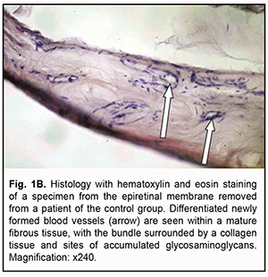 At day 3 after a 1.0 mg intravitreal aflibercept injection, there was ophthalmoscopic evidence of complete obliteration of newly formed blood vessels in epiretinal membranes in 50% of patients (4 eyes). At day 5 after a 1.0 mg intravitreal aflibercept injection, examination showed complete obliteration of newly formed blood vessels in epiretinal membranes in all cases (9 eyes). In addition, no change in visual acuity was noted in any patient following 1.0 mg intravitreal aflibercept injection. Of the 27 eyes that received 1.0 mg intravitreal aflibercept injection, 3 (17.6%) showed evidence of worsening of the tractional component due to ERM contraction. Heterogeneous morphology at various sites of the membrane was a morphological feature of epiretinal membranes following 1.0 mg intravitreal aflibercept injection. Of special note that a number of blood vessels in the membranes were less than for the patients who did not receive aflibercept therapy, and these vessels were mainly the capillaries and not completely differentiated. Vessel formation sites alternated with sites of bundles of differently oriented collagen fibers. Another essential feature was the presence of numerous cells of the types (particularly, fibroblasts and astrocytes) that were morphologically different from each other. Both types of cells are spindle-shaped and have rod-like nuclei, and differ only in size. Fibroblasts are larger and arranged along walls of capillaries (Fig. 2A). In addition, one specimen showed mild lymphocytic infiltration of the membrane, indicating the presence of inflammation (Fig. 2B). At day 3 after 1.0 mg intravitreal aflibercept injection, non-obliterated newly formed vessels were seen on some histological specimens of removed ERMs (Fig. 2C). At day 5 after 1.0 mg intravitreal aflibercept injection, histological specimens of removed ERMs showed a dense and fibrous connective tissue composed of spindle-shaped cells and obliterated newly formed vessels (Fig. 2D).