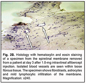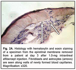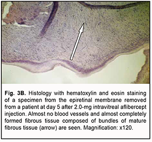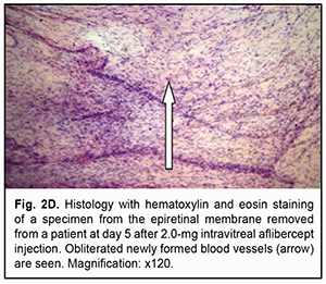Such complications as endophthalmitis and/or fibrous inflammatory reaction were not observed in any case. Transitory increased IOP was noted in all patients following 1.0-mg or 2.0-mg aflibercept injection, and did not require hypotensive medications. Discussion Preoperative intravitreal anti-VEGF therapy for prevention of hemorrhagic complications has been widely used since the first years of the 21st century. Current developments of anti-VEGF therapy are targeted at the synthesis of medications capable of inhibiting an increasing number of angiogenic factors. One of the first anti-VEGF medications was pegaptanib, a pegylated oligonucleotide that selectively binds VEGF165 [11,12]. However, it has been, not registered in most countries because it is less potent than other anti-VEGF agents. Bevacizumab (Avastin; Genentech, Inc., South San Francisco, CA) is a full-length monoclonal humanized antibody, whereas ranibizumab (Lucentis, Genentech, Inc., South San Francisco, CA) is a fragment of the above antibody. Both of them bind all isoforms of VEGF-A, but the use of bevacizumab remains off-label in ophthalmology [12, 13, 14, 15]. Aflibercept is a recombinant fusion protein that consists of portions of VEGF receptor (R) 1 and VEGFR2 extracellular domains fused to the Fc portion of human immunoglobulin G1 (Ig1). Unlike other anti-VEGF agents, it binds not only to all isoforms of VEGF-A, but also to VEGF-B and placental growth factor [16]. Experience has been gained with the use of anti-VEGF agents in vitreoretinal surgery for PDR. Various authors reported that complete obliteration of neovascularization was achieved within 3-5 days after intravitreal bevacizumab injection, which allowed for a fast and efficacious vitrectomy for PDR. In some cases, however, the contraction of the ERM caused worsening of the tractional component and the development of retinal breaks. These complications usually developed 10-14 days after injection [17]. In addition, because bevacizumab has been used off-label in ophthalmology, it has been not approved for use in ophthalmology in many countries, including Ukraine. Ranibizumab is another drug developed for intravitreal use. Various studies have demonstrated that intravitreal ranibizumab pretreatment in vitrectomy for PDR was effective. Obliteration of newly formed blood vessels in the epiretinal membrane was observed seven days after intravitreal ranibizumab (Lucentis, 0.5 mg in 0.05 ml solution for injection, Novartis Pharmaceuticals UK Ltd) injection, somewhat later than following intravitreal bevacizumab injection [18]. Because in the ROTATE trial [19], ranibizumab 0.3 mg (i.e., half of the standard dose) demonstrated improved visual and anatomic outcomes in patients with persistent diabetic macular edema following bevacizumab, we supposed that half of the standard dose will allow to achieve obliteration of newly formed blood vessels in the epiretinal membrane, reduce the frequency of intraoperative and postoperative hemorrhagic complications, and reduce the risk of complications associated with worsening of the tractional component in ERM and the development of retinal breaks in patients with PDR. We found that, in patients with PDR of 1.0-mg aflibercept and 2.0-mg aflibercept groups, obliteration of newly formed blood vessels in the fibrovascular ERM with a marked proliferative component was seen as early as day 5 after aflibercept injection. However, of the 27 eyes that received 2.0 mg intravitreal aflibercept injection, 23 (85.2%) showed ophthalmoscopic evidence of worsening of the tractional component due to ERM contraction, which resulted in the development of a retinal break in 2 eyes (7.4%). In addition, of the 27 eyes that received 1.0 mg intravitreal aflibercept injection, 3 (17.6%) showed evidence of worsening of the tractional component, but no eye developed a retinal break. Hsu and colleagues [20] investigated the clinical, histopathological, and surgical features of the epiretinal membrane (ERM) after diabetic vitrectomy. Histopathological examinations of ERMs in 6 of 16 cases showed abundant collagen fibers with epithelial cells, which is in agreement with our findings. Immunohistochemical staining with CD 34 demonstrated the presence of vascular endothelium in two of the six specimens [20]. In the current study, newly formed blood vessels in the fibrovascular ERM were obliterated at day 3 after 2.0-mg intravitreal aflibercept injection, whereas individual newly formed capillaries were seen in the fibrovascular ERM at day 3 after 1.0-mg intravitreal aflibercept injection. In addition, at day 5, histological specimens of removed ERMs from both aflibercept injection groups showed a dense and fibrous connective tissue and obliterated newly formed blood vessels. We also found that activation of the tractional component was more common after 2.0-mg intravitreal aflibercept injection, and can lead to the development of a retinal break. Therefore, in patients with PDR receiving the standard dose of intravitreal aflibercept, it is reasonable to perform vitrectomy at day 3 after injection, when most newly formed vessels in the ERM are already obliterated, and the risk of worsening of the tractional component is not high. In patients with PDR receiving 1.0-mg intravitreal aflibercept injection, vitrectomy should be performed at day 5 after injection, given the fact of obliteration of newly formed blood vessels in the ERM at this time. Therefore, there was ophthalmoscopic and microscopic evidence that aflibercept pretreatment in vitrectomy for PDR resulted in fibrosis of the epiretinal fibrovascular membrane with a marked proliferative component. The extent of fibrosis of the fibrovascular membrane and obliteration of newly formed blood vessels in the ERM depended on the dose of intravitreal aflibercept. Thus, complete obliteration of newly formed blood vessels in the epiretinal membrane was observed as early as day 3 after 2.0-mg intravitreal aflibercept 
