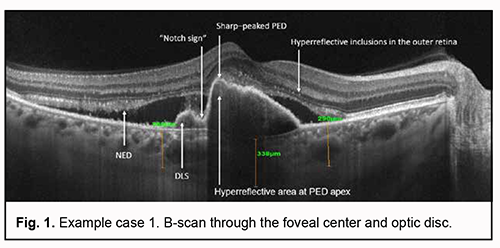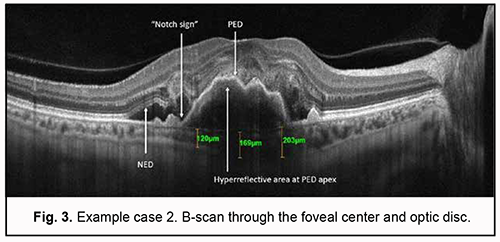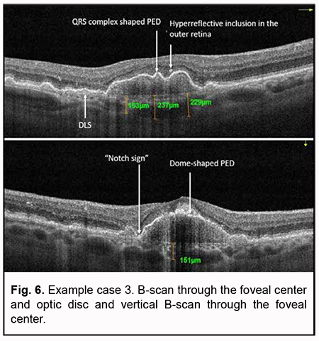 A high QRS complex shaped PED characteristic of PCV was found on examination of OCT scans for this example case (Fig. 3). There were such characteristic OCT features strongly suggestive of PCV as a “notch sign” and hyperreflective area at PED apex. Although a DLS was not detected on any macular B-scan, there were additional OCT features (like NED and hyperreflective inclusions in the outer retina) indicating the activity of suspected neovascularization.