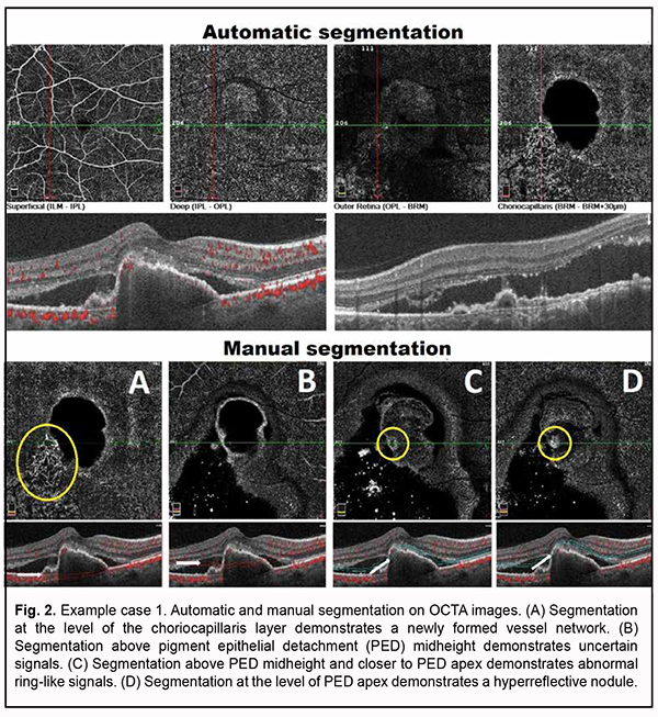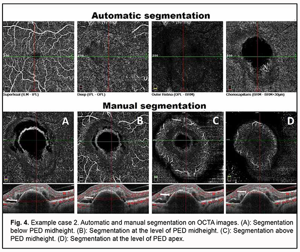 Pathological blood flow signals without the presence of apparent neovascularization were detected at the choroidal level, along the inferior outline of the shadow corresponding to PED. No pathological blood flow was detected within the outer retina and at the level of the retinal superficial and deep vascular plexuses. Manual segmentation assessment was subsequently used for deeper analysis (Fig. 4).