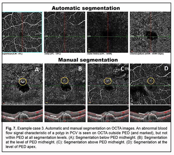 Step 2. No abnormal blood flow signal characteristic of a polyp in PCV was detected above PED midheight, at PED apex or at any other segmentation level. Taking into consideration the results of our OCTA scan assessment at various segmentation levels, Step 3 was omitted.