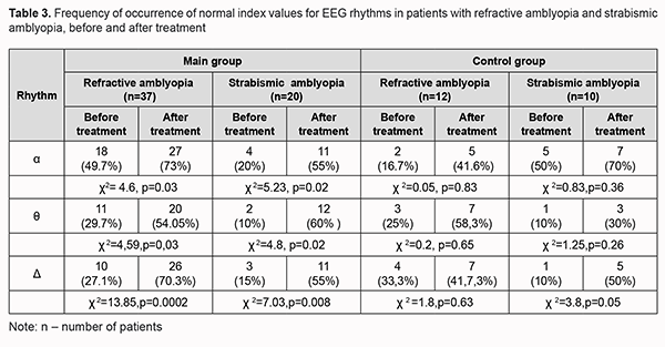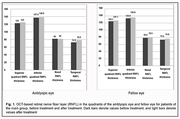 High frequency beta index was within normal range (3.5 ± 2.5%) and did not change significantly in either group after treatment. In most children with amblyopia (53%), baseline alpha index was below the normal range, with a mean value of 14.6±12.3%. In addition, mean baseline delta and theta indices were 70.1 ± 9.9% and 11.1 ± 8.7%, respectively, which was above the normal range. This may indicate immature cortical electrogenesis as well as the patient’s inadvertence during EEG recording [13, 14, 32, 34]. Baseline delta indices were lower, whereas baseline theta indices higher in children with refractive amplyopia compared to those with strabismic amblyopia (55.2% vs 74.8% and 13.6% vs 7.1%, respectively; р < 0.05). After treatment with adjunct neuroprotective agent, alpha index became normal in 73% of children with refractive amblyopia, and in 55% of children with strabismic amblyopia, and was 15.2 ± 8.6% (at an amplitude of 65 ± 10.2 µV). We have previously reported that alpha index ranged from 15% to 30% in children with amblyopia [13]. In the current study, in most children with amblyopia (53%), baseline alpha index was below the normal range, with a mean value of 14.6±12.3%. In addition, mean baseline delta and theta indices were 70.1 ± 9.9% and 11.1 ± 8.7%, respectively, which was above the normal range (22.5±10.3%) [32, 34]. After comprehensive treatment with adjunct neuroprotective agent, alpha index became normal (14.6 ± 12.3%) in 27 of 37 of children (73%). In addition, delta and theta indices decreased to 58±9.6% and 7.8±6.7%, respectively, indicating improved function of the visual system and a tendency towards normal electrogenesis of cortical neurons, which was accompanied clinically by an improvement in visual acuity. After treatment, alpha index became normal in 9 of 22 children with refractive amblyopia (41.6%) of the control group (versus 73% for the main group, χ2=6.0, р=0.01). In addition, delta and theta indices decreased and became normal in 54% and 60% of children, respectively, of the main group. Moreover, delta and theta indices decreased and became normal in 58% and 30%, and 33% and 50%, of children with refractive amblyopia and strabismic myopia, respectively, of the control group. Discussion It can be concluded from the literature that RNFL thickness measurements do not tend to be affected by eccentric fixation [24, 25, 35-40], and this morphometric index is reproducible and objective. It has been demonstrated that refractive error of the eye is associated with RNFL, and that RNFL is thicker in hyperopes than in emmetropes and thinner in myopes than in emmetropes [18, 38, 41, 42]. Although many others [34, 36, 37] have noted RNFL thickness vary between eyes with different types of amblyopia [38, 41, 42], the effect of a neuroprotective agent on changes in retinal thickness has not been studied until now. The current study found that the neuroprotective agent as an adjunct in the comprehensive treatment of amblyopia increased temporal RNFL thickness from 72.5±14.6 µm at baseline to 78.5±22.0 µm, which may indicate an increase in the interneuronal connections in the retina. Alpha-rhythm reflects the degree of maturation of the cortical structures [31], whereas the occurrence of rhythmic slow activity with theta and delta percent time > 10% indicates immature brain structures [32, 38]. EEG studies [16, 38] have demonstrated that there is a gradual transition from low-frequency brain rhythms to those of a higher frequency in phylogenesis [32]. To the best of our knowledge, this is the first study to investigate alpha, beta, delta and theta percent times before and after application of a neuroprotective agent as an adjunct in the treatment of various types of amblyopia. We found the neuroprotective agent to be a beneficial adjunct in the comprehensive treatment of children with amblyopia, with (a) increased to normal alpha index values in 73% of children with refractive amblyopia, and in 55% of children with strabismic amblyopia, versus 41.6% for children treated with conventional therapy only, and (b) decreased delta and theta index values (to 58±9.6% and 7.8±6.7%, respectively) in 54% of children with refractive amblyopia, and in 60% of children with strabismic amblyopia, versus 41.7% and 50%, respectively, for children treated with conventional therapy only. In addition, improvements in visual acuity and contrast sensitivity were more marked in amblyopic patients treated with adjunctive neuroprotective agent than in those treated with conventional therapy only. Therefore, the neuroprotective agent as an adjunct in the comprehensive treatment of amblyopia increased temporal RNFL thickness and improved interneuronal connections in the retina and rhythm indices related to EEG rhythms, which facilitated the development of the visual system and was accompanied by an improvement in visual acuity. References 1. Avetisov ES. [Strabismic amblyopia and its management]. Moscow: Meditsina; 1968. Russian. 2.Avetisov SE. Kashchenko TP, Shamshinova AM., editors. [Visual functions and their correction in children]. Moscow: Meditsina; 2006. Russian. 3. Demer JL, von Noorden GK, Volkow ND, Gould KL. Imaging of cerebral blood flow and metabolism in amblyopia by positron emission tomography. Am J Ophthalmol. 1988 Apr 15;105(4):337-47. 4. Hubel DH, Wiesel TN, LeVay S. Plasticity of ocular dominance columns in monkey striate cortex. Philos Trans R Soc Lond B Biol Sci. 1977 Apr 26;278(961):377-409. 5. Crawford MLJ, von Noorden GK, Meharg LS, et al. Binocular neurons and binocular function in monkeys and children. Invest Ophthalmol Vis Sci. 1983 Apr;24(4):491-5. 6. Ibatulin RA. [Visual functions in amblyopia as assessed by psychophysical and electrophysiological studies]. Thesis of dissertation for the degree of Dr Sc (Med). Moscow: Helmholtz Research Institute of Eye Diseases; 1998. Russian. 7.Ikeda H. Visual acuity, its development and amblyopia. J R Soc Med.