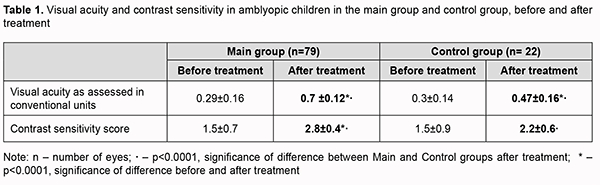 Introduction Amblyopia is a common cause of visual loss in children, accounting for 4-6% of cases of pediatric eye disorders [1, 2]. Findings of recent animal and clinical studies on the pathogenesis of amblyopia allowed concluding that amblyogenic factors prevent a healthy visual pathway from forming between the eye and the brain during the critical period of neurodevelopment [3]. Amblyopia is characterized by histopathological changes in the visual cortex and lateral geniculate nucleus, and the severity of these changes depends on the type of amblyopia. Although mo retinal morphological changes have been found in amblyopic eyes [4, 5], functional changes have been reported in the retinal receptive fields in amblyopic eyes [6-9], and these fields are implicated in contrast sensitivity and form vision. Studies on deprivation found that form vision deprivation affects not so much retinal morphology but rather retinal neurotransmitters, contributing to decreased dopamine and tyrosine hydroxylase synthesis and increased vasoactive intestinal peptide levels. Binocular cortical neurons respond to stimulation of either eye, and Crawford and colleagues [5] reported that the major abnormality in this disease lies in loss of these neurons. It has been experimentally demonstrated that visual cortex plasticity depends on n-methyl-D-aspartate (NMDA) receptors which improve synapse formation. NMDA glutamate receptors mediate visual signal transmission. Acetylcholine, serotonin, and noradrenaline are delivered from the pons to the visual cortex and are involved in visual information transmission to the visual system [10, 11]. Functional abnormalities in amblyopia have been widely studied, and a reduction in practically all visual functions (light sensitivity, color sensitivity, electrophysiological optic nerve function, bioelectrical cortex activity, and etc.) has been demonstrated [12, 13]. Because functional abnormalities of the cortical and subcortical visual system are involved in the etiopathogenesis of amblyopia, EEG studies in amblyopes have been interesting for ophthalmologists for decades. In the 1970s and 1980s, studies by Soviet ophthalmologists [9] investigated EEG rhythm patterns in strabismic patients. In a study by Avetisov and colleagues [1, 2], 82.2% of cases with non-accommodative strabismus showed pathological EEG patterns. They found changes in the alpha rhythm parameters and occurrence of pathologic delta and theta waves in 91 of 110 patients, which indicated damage to the brainstem, basal and pontine structures. They, however, did not mention, whether there were amblyopic children among the study objects. Zislina and Sorokina [15] and Zislina and Shamshinova [16] used visual evoked potential (VEP) response to pattern stimuli and pattern VEP topographic mapping and analyzed the VEP that were extracted from the occipital EEG of patients with refractive and strabismic amblyopia. They demonstrated normal VEP composition and distinct difference in configuration between flash- and pattern reversal evoked-VEP for these patients. Strabismic amblyopia is believed to be the most severe form of amblyopia. Boichuk and colleagues [12, 13] determined the pattern of EEG changes typical of strabismic amblyopia. These abnormalities can be detected either in the hemisphere contralateral to the amblyopic eye or in both brain hemispheres based on the background EEG data and EEG response to functional load like the absence of eye opening response and rhythmic driving response to unilateral and bilateral photic stimulation and occurrence of bilaterally asymmetrical and synchronous theta and delta waves in occipital and frontal responses (theta and delta percent time of 46-48% can be used as a criterion of the amblyopia-related abnormality located in the visual cortex and in the cortical and subcortical visual system). Defects in visual functions in amblyopic eyes may have a neuroretinal explanation. Studies by Lempert [17, 18] used optic disc rim areas, corrected for magnification, retinal areas, and a derived ratio, retinal area/disc rim area (RetA/DRimA) as main outcome measures, and found, that the RetA/DRimA of the fellow eyes was smaller than for the amblyopic but larger than that of the normal eyes. These differences were due to smaller optic disc rim areas in the amblyopic and fellow eyes, leading to expansion of the retinal receptive field. It was concluded that amblyopic and their fellow eyes, when compared with normal eyes, have reduced innervations of comparable retinal areas. These differences can be attributed to a paucity of nerve fibers, as indicated by the smaller neuroretinal rim areas. Therefore, optical coherence tomography (OCT) data can be used in diagnostic assessment as well as the assessment of retinal changes in various forms of strabismic amblyopia. It has been reported that the use of some medications as adjuncts to conventional treatment can increase brain sensitivity to treatment and improve treatment response in amblyopia [10, 19-22]. Citicoline is a complex biomolecule that plays a role in cellular metabolism [10, 20] and might be used to enhance the transmission of pulses in the retina. It is a mononucleotide, a choline precursor and serves as a choline donor in acetylcholine biosynthesis. Citicoline is involved in the renewal and synthesis of the phospholipids of cell membranes and neuromediators such as acetylcholine and dopamine. Phospholipid synthesis and renewal provide a basis for neuroprotection [11, 19, 23]. Citicoline decreases phospholipase stimulation, thus preventing apoptotic and necrotic cell death [11, 23], and serves as a factor of growth of optic nerve fibers in degenerative eye disease [20]. Experimental findings [24, 25] implicate that dendritic growth may be impaired due to inadequate light stimulation of the retina during the development of inner and outer retinal layers. In such cases, dendrites of adjacent cells may fill the gap, leading to displa