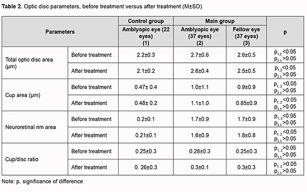 Mean baseline RNFL in patients of the main group was thicker than the age norm primarily due to RNFL thickness in the inferior quadrant (137.5±27.3 µm for the amblyopic eye and 132.8±23.2 µm for the fellow eye) and nasal quadrant (82.0 ± 22.8 µm for the amblyopic eye and 78.4 ± 19.4 µm for the fellow eye). The temporal quadrant had the thinnest RNFL thickness among all four quadrants. After treatment, the RNFL thickness in the inferior and nasal quadrants decreased, and in the superior and nasal quadrants increased, but not statistically significantly, whereas in the temporal quadrant increased significantly from 72.5±14.6 µm to 78.5±22.0 µm, which may indicate an increase in the interneuronal connections in the retina. No significant difference between post-treatment and baseline data for other quadrants was observed. To the best of our knowledge, there have been no studies on post-treatment changes in OCT-based RNFL thickness in amblyopic and fellow eyes. There was no significant change in OCT-based morphometric parameters of the retina in eyes of the control group after treatment. Table 2 shows OCT-based parameters of the optic nerve in eyes of both groups after treatment.