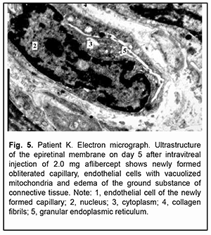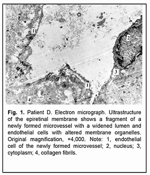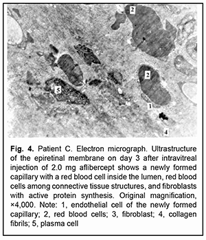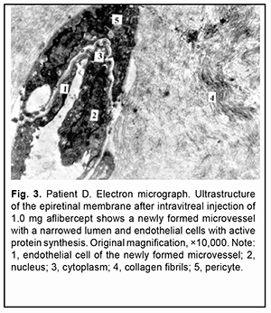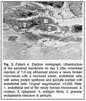 Large microvessels were irregularly shaped, and their endothelial cells had a large nucleus surrounded by a narrow cytoplasm. The microvessel wall was covered mostly by thinned hyaloplasm of endothelial cells with electron-dense matrix and single altered organelles. Some of these cells exhibited clusters of lysosomes and osmiophilic granules. Endothelial cells in other microvessels appeared necrotic. Only new capillaries were fenestrated, and they showed few fenestrations. Endothelial cell basal membrane appeared confluent with the plasmalemma of these cells which appeared thicker and electron denser than the plasmalemma at the luminal side of these cells. In some newly formed vessels, the basal membrane was not visualized. Pericytes were rarely seen; they were large and had a large nucleus surrounded by a narrow cytoplasm. Their structures could not be differentiated from each other. Some of these vascular cells appeared necrotic. The ERM fragment that had been taken on day 3 after intravitreal injection of 1.0 mg aflibercept showed active proliferation compared to that taken before injection: the connective tissue showed an increased number of (a) collagen fibrils which were arranged more closely to each other and (b) the cells (especially large fibroblasts) with signs of activated protein synthesis. Newly formed blood microvessels were seen among collagen fibrils, and the lumen of these vessels was narrower compared to that in the control ERM. The microvessel wall was covered only by large endothelial cell bodies (hypertrophied cells), and the number of organelles in the hyaloplasm of these cells was larger than that in the control ERM. These cells had active metabolism (particularly, metabolism of protein synthesis), which was indicated by an enlarged (and sometimes lobular) nucleus with invaginations or deep folds; an active nucleolus; large extended cisternae of the granular endoplasmic reticulum (GER) which were in contact with karyoplasms; and numerous hyaloplasm mitochondria. Microclasmatosis was observed at the luminal side of microvessels. Of note is that, in newly formed microvessels of these ERMs, the lumen was practically half as narrow as that in microvessels of the ERM in controls. Fenestrations were not visualized in the images (Fig. 2).