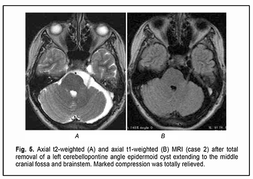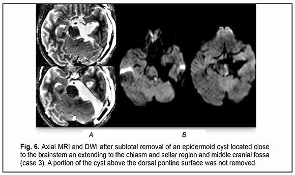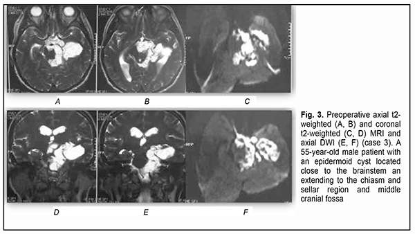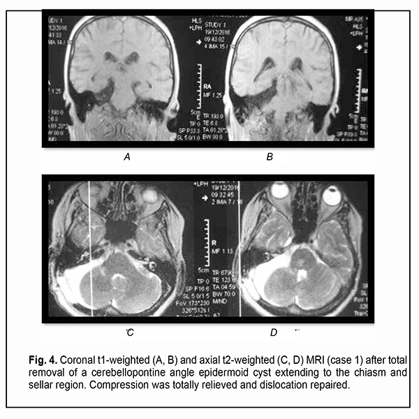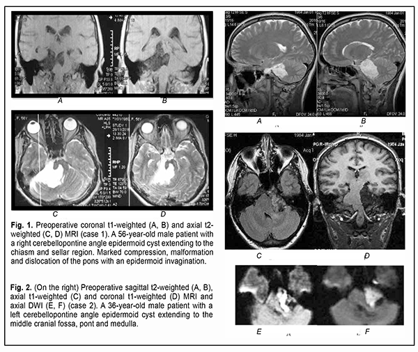 Introduction Epidermoid cysts manifest themselves clinically predominantly between the ages of 20 and 50 years, most commonly occur in the skull base, and usually arise in the subarachnoid cisterns, cerebellopontine angle and parasellar region. They grow slowly and can attain a large size before the onset of neurological symptoms. As the neoplasm grows, it gradually presses on, displaces and envelops the cranial nerves (CN) and adjacent vessels, and frequently invaginates the brainstem, causing ophthalmological abnormalities and lesions of relevant CN (Fig.1, 2, 3) [1, 2, 3].