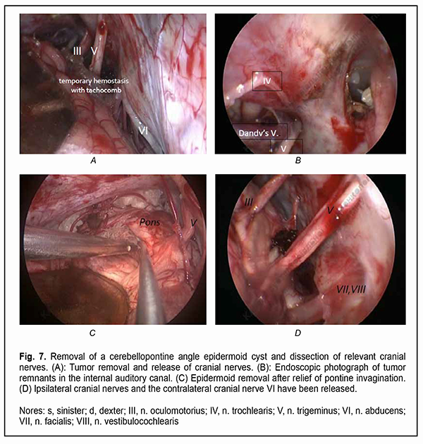 The extent of epidermoid cyst removal for the cases of brainstem involvement was limited by at least a fifty-percent difference between preoperative and intraoperative somatosensory and brainstem evoked potentials. Eight of the 13 patients with no preoperative neurologic deficiency exhibited no loss of function of CN III, CN IV, CN V, CN VI, CN VII and/or brainstem in the postoperative period, in spite of moderate adhesions between the capsule and nerve roots. Out of the 21 patients, 13 (61.9%) did exhibit loss of function of CN III, CN IV, CN V, CN VI, CN VII and/or brainstem (isolated or combined cranial nerve palsy) in the postoperative period due to severe adhesions between the capsule and cranial nerves as well as efforts to perform radical tumor excision. Discussion Although there is no general consensus regarding the surgical strategy for patients with a skull-base epidermoid cyst, microneurosurgical removal of these cysts and the use of intraoperative monitoring and endoscopic equipment are believed to be essential and relevant [10, 11, 17]. Our strategy of as total as possible epidermoid removal in the presence of severe adhesions between the capsule and cranial nerve(s) and/or brainstem is in agreement with those of others [5, 6, 7, 9], but this strategy did not enable the achievement of total tumor removal in some cases. In addition, it is most likely that is was the efforts to perform radical capsule dissection that caused early postoperative neurologic loss in some of these patients. However, our data are in some disagreement with those of some previous authors [11, 12, 16], and, in the current study, the best functional treatment outcomes for the late postoperative period were observed after total or near total tumor removal. Most of the authors have noted that patients with skull-base epidermoid cysts with cranial nerve involvement were characterized by a disproportion between, on the one hand, rather substantial cranial nerve compression, dislocation and distortion and, on the other hand, minor neurological symptoms. It is likely to be caused by prolonged and slow growth of the tumor and adaptation of brain structures. Consequently, even the most careful release and dissection of cranial nerve(s) from the capsule under intraoperative monitoring and under the highest available microscope/endoscope magnification cannot guarantee complete functional preservation [1, 2, 3]. In addition, in the current study, there were cases in which total tumor removal with the dissection of capsule fragments from cranial nerves or brainstem did not result in cranial nerve dysfunction, and sometimes recovery of impaired cranial nerve functions was seen even after the dissection of these nerves from the capsule. This is also in agreement with findings of others. An improvement of cranial nerve function has been reported also after partial dissection of the epidermoid capsule [4-10]. Rehmanet and colleagues (2017) [6], Altschuler and colleagues [9] (1990), and Lynchet et al (2014) [10] reported that, in a number of cases, cranial nerve functions deteriorated early after partial or total dissection of the capsule, but neurological and ophthalmological status improved and recovered in the later postoperative period. Although the relationship between the degree of traction of neural structures and intraoperative monitoring data is important technically, we cannot identify the statistical relationship between the data of intraoperative CN monitoring and functional outcomes in the current material. However, as per our experience, it is these manipulations that should be performed under maximum microscope magnification (24х), meticulously and in close cooperation with a neurophysiologist. Given the epidemiology of these neoplasms, there is a need for further research and accumulation of multicenter data on radicality of surgery (taking into account the prevention of aseptic meningitis, cyst recurrence, intraoperative monitoring criteria, and the potential for rehabilitation of impaired cranial nerve functions) [10, 11, 17] for improved clarification of treatment strategy and obtaining statistically significant results. Therefore, total removal of complex skull-base epidermoid cysts extending into several cranial compartments can be performed through the simultaneous use of combined or two-port approaches. The dissection of the capsule from cranial nerves and/or brainstem should be performed under the highest available microscope/endoscope magnification and with intraoperative cranial nerve monitoring. In addition, the radicality of dissection depends on the degree of adhesion between the cyst capsule and surrounding neurovascular structures as well as on the potential for safe surgical manipulations on these structures. We did not observe a statistically significant relationship between the recovery of cranial nerve functions and the duration from the onset of symptoms to surgery. We found that endoscopic-assisted radical removal of the epidermoid cyst under the highest available microscope magnification with intraoperative cranial nerve monitoring was safe and effective for preserving cranial nerve functions in the late time points after surgery. References 1.You E, Bokhari R, Sirhan D. Split-Pons Syndrome by Epidermoid Cyst: A Case Report and Review of the Literature. World Neurosurg. 2019 Nov;131:275-280.e1. 2.Podeur P, Okhremchuk I, Morvan JB, Vatin L, Rivière D, de Faria A, et al. [Multiple intracranial epidermoid cysts: Case report]. Rev Laryngol Otol Rhinol (Bord). 2015;136(4):159-62. French. 3.Berger MS, Wilson CB. Epidermoid cysts of the posterior fossa. J Neurosurg. 1985 Feb;62(2):214-9. 4.Zhou F, Yang Z, Zhu W, Chen L, Song J, Quan K, et al. Epidermoid cysts of the cavernous sinus: clinical features, surgical outcomes, and literature review. Neurosurg. 2018 Oct;129(4):973-83. 5.Yaşargil MG, Abernathey CD, Sarioglu AC. Microneurosurgical treatment of intracranial dermoid and epidermoid 