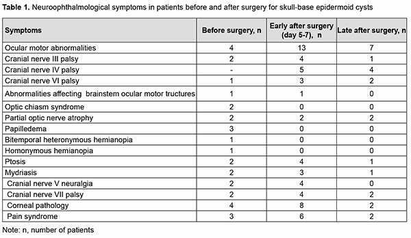 Results Of the 21 neoplasms, 7 (33.33%) were seen just to the right of the brainstem, including 2 (9.52%) that had a supratentorial extension; 9 (42.87%) were seen just to the left of the brainstem, including 3 (14.28%) that had a supratentorial extension; and 5 (23.8%) were located along the midline (cysts of the fourth ventricle). Of the 5 cysts (23.8%) that had a supratentorial extension, 2 (10%) extended to the middle and posterior fossa, with involvement of the chiasm and optic nerve. MRI-based neoplasm dimensions and volume varied from 24х22х18 mm до 54х57х44 mm and from 4.75 cm3 to 67 cm3, respectively, although volume estimation could not be accurate due to a complex shape and extension of epidermoids. Table 1 shows longitudinal changes in neuroophthalmological symptoms in patients who underwent surgical removal of a skull-base epidermoid cyst.