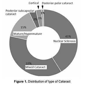 Nuclear sclerosis was present in 41.4% of eyes, mixed cataract in 36.9%, mature/hyper mature cataract in 14.9%, posterior subcapsular cataract in 3.2%, cortical in 2.6%, and posterior polar cataract in 1% of eyes (Figure 1).