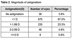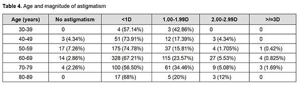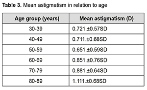 There was no astigmatism in 3.8% of eyes. With the rule, astigmatism was found in 318 (31.8%) eyes against the rule astigmatism was found in 498(49.8%) eyes and oblique astigmatism in 149(14.9%) eyes. With the increasing age, the WTR percentage decreased while the ATR percentage increased. The Mean keratometry was 44.12 ± 1.71D with 38.8 – 52 D range. The mean astigmatism was 0.80D ± 0.72 (mean±SD) ranging from 0 -6.25D. Patients were classified depending upon the magnitude of astigmatism. Mean astigmatism in relation to age was calculated by totalling the amount of astigmatism in each group and dividing the sum by the number of patients in that group. It is revealed that astigmatism less than 1D is the most common astigmatism in all age groups. However, the percentage of higher astigmatism was higher in extreme age groups. (Table 3).