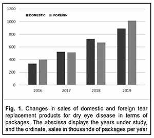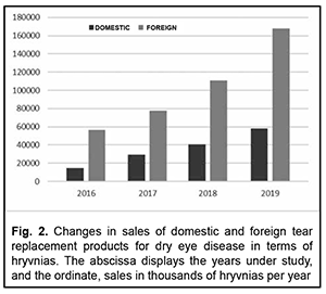Introduction Management of dry eye syndrome (DES, also known as dry eye disease) is a current medical, pharmaceutical and social issue both globally and in Ukraine, with 10-30% of working-age adults having DES [1, 2]. The condition is a tear film disorder [3, 4] with a variety of subjective symptoms [5, 6] including eye dryness, itching, scratchiness, pain, stinging or burning, redness, tearing, foreign body sensation, blurry vision, light sensitivity, increased sensitivity to environmental factors, etc. [7, 8]. The disease does not cause death directly, but significantly impairs quality of life [3, 9] and imposes a significant cost burden on patients, society and healthcare systems. These costs may include those due to visits to an ophthalmologist [10], diagnostic assessment procedures [11], and temporary loss of capacity to work and pharmacological therapies [12, 13]. Over-the-counter tear replacement products (TRPs) are the first line of therapy for DES [14–16]. Their mechanism of action is associated with the impact on certain components of an impaired tear film renewal in dry eye syndrome [17, 18]. Since there is paucity of available data on the use of and expenses for over-the-counter TRPs, the purpose of the study was to assess changes in quantitative characteristics of the Ukrainian market of tear replacement products for dry eye treatment solutions over 2016-2019. This will allow assessing and making predictions regarding the financial burden on patients and health-care system utilization for dry eye disease pharmacotherapy. Material and Methods We conducted the analyses of changes in retail sales characteristics over the period of 2016-2019 based on the results of our previously performed marketing analysis of the tear replacement products available in the Ukrainian pharmaceutical market [19]. Data from the national pharmacy-related registers (the State Register of Medicines of Ukraine [20] and the State Register of Medical Equipment and Medical Devices of Ukraine [21]) and from PharmXplorer [22], a marketing research database from Proxima Research LLC, were used for research. Sales were assessed in terms of both packages and Ukrainian hryvnias (₴). Retrospective, structural and graphical methods were used for research. Market segmentation categories included the manufacturer’s country of origin, price niches and TRP components. An increase in tear replacement sales in terms of both packages and Ukrainian hryvnias (₴) was assessed using the following formula: ΔM=(Sy+1 - Sy)*100%/Sy, where ΔM is a percentage increase in the market size, Sy+1 is TRP sales in the year following the comparison, and Sy is TRP sales in the year of comparison. Results Figures 1 and 2 show changes in the amount of sales of TRPs for treating DES in terms of packages and hryvnias, respectively, over 2016-2019. The results obtained indicate that domestic and foreign manufacturers had approximately equal shares of the Ukrainian market of TRPs (as assessed in thousands of packages per year), although of the TRPs available on the market, only 10.7% were Ukrainian products. However, the percentage difference between annual UAH amounts of retail sales of TRPs from foreign manufacturers and those from Ukrainian manufacturers varied from 267.47% in 2017 to 383.52% in 2016 (and was 271.49% and 289.24% in 2018 and 2019, respectively).