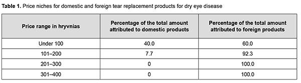 The portion of TRPs containing mineral oils in combination with other active pharmaceutical components (APC) was the largest (25%) in the ₴301-₴400 niche. All TRPs containing povidone were in the ₴201-₴300 niche. Sodium hyaluronate-based TRPs were present in three price niches, with the highest percentage in the most expensive one. The combination products containing omega-3 fatty acids, polyvinyl alcohol and povidone were present in the ₴101-₴200 niche. Equal shares of combination hydroxypropyl guar-containing TRPs were present in the ₴101-₴200 niche and the ₴201-₴300 niche. The price of most multicomponent sodium hyaluronate-based TRPs was between ₴201 and ₴300, the price of more than a quarter of these products, under ₴100, whereas that of the rest, between ₴101 and ₴200. All TRPs containing both dexpanthenol and taurin were in the cheapest niche (under ₴100). The price of the single component products containing methylcellulose derivatives as well as of those containing carbomer, was under ₴200. The number of TRPs as well as the number of combinations of APCs was the largest in the second niche (i.e, the ₴101-₴200 niche), and the lowest in the fourth niche (i.e, the ₴301-₴400 niche). The segmentation of retail sales of all TRPs available in the Ukrainian pharmaceutical market found that the TRP containing both dexpanthenol and taurin had the highest annual hryvnia sales and the highest annual package sales. This product is in the lowest price niche, manufactured in Ukraine, and is registered as a medical device. Because any TRP is registered in Ukraine either as a medicinal agent or as a medical device, the percentages attributed to medicinal agents and those attributed to medical devices were calculated for each price niche. The price niches varied in the ratio of the percentages attributed to medicinal agents and to medical devices. The ratio was greater than 1 for the highest price niche (i.e, the ₴301-₴400 niche), and substantially smaller than 1 for other niches. A limitation of the presented analysis of tear substitution products for treating DES is that the presence of preservatives and the quality of buffer solution contained in a product was not taken in account. However, this is important, because usually a TRP is used for a rather long time and should be safe for patients. Nevertheless, some aspects of this issue were addressed in our previous study [23]. Conclusion The current study found that the number of domestic TRPs in the Ukrainian pharmaceutical market is limited. Since the above TRPs are in the low price segment and leaders in terms of amount of sales in packages, it is reasonable and promising to stimulate pharmaceutical science to develop highly-efficient and affordable TRPs of various compositions. In addition, a stable and positive increase in TRP retail sales both in packages and hryvnias indicates a stable increase in demand for therapeutic products for dry eye patients. A Ukrainian lowest-price niche medical device containing both dexpanthenol and taurin was an absolute leader of 2016-2019 TRP retail sales in terms of both packages and hryvnias. The results obtained will be used to determine seasonal changes in sales of tear replacement products for treating dry eye disease. Moreover, the pandemic caused by SARS-CoV-2 resulted in an increased use of gadgets by individuals of various age groups, potentially leading to an increased occurrence of the symptoms associated with visual system overload (particularly, dry eye syndrome), and we plan to compare characteristics of 2016-2019 TRP retail sales with those after the beginning of the pandemic caused by SARS-CoV-2. References 1.[Dry eye syndrome. Evidence-based clinical guidance]. [Internet]; 2019. Ukrainian. Available from: https://www.dec.gov.ua/wp-content/uploads/2019/11/2019_10_02_kn_syndrom_.... 2.Stapleton F, Alves M, Bunya VY, Jalbert I, Lekhanont K, Malet F, et al. TFOS DEWS II epidemiology report. Ocul Surf. 2017;15:334-65.. 3.Craig JP, Nelson JD, Azar DT, Belmonte C, Bron AJ, Chauhan SK, et al. TFOS DEWS II Report Executive Summary. Ocul Surf. 2017 Oct;15(4):802-12. 4.Bron AJ, de Paiva CS, Chauhan SK, Bonini S, Gabison EE, Jain S, et al. TFOS DEWS II pathophysiology report. Ocul Surf. 2017;15:438-510. 5.Craig JP, Nichols KK, Akpek EK, Caffery B, DuaHS, Joo CK, et al. TFOS DEWS II definition and classification report. Ocul Surf. 2017;15:276-83. 6.The management of dry eye. Drug Ther Bull. 2016;54(1):9-12. 7.Jones L, Downie LE, Korb D, Benitez-del-Castillo JM, Dana R, Deng SX, et al. TFOS DEWS II management and therapy report. Ocul Surf. 2017;15:575-628. 8.Willcox MDP, Argüeso P, Georgiev G, Holopainen J, Laurie G, Millar T, et al. TFOS DEWS II tear film report. Ocul Surf. 2017;15:366-403. 9.Friedman NJ. Impact of dry eye disease and treatment on quality of life. Current Opinion in Ophthalmology. 2010;21(4):310-6. 10.Alves M, Fonseca EC, Alves MF, Malki LT, Arruda GV, Reinach PS, et al. Dry eye disease treatment: a systematic review of published trials and a critical appraisal of therapeutic strategies. Ocul Surf. 2013;11(3):181-92. 11.Wolffsohn JS, Arita R, Chalmers R, Djalilian A, Dogru M, Dumbleton K, et al. TFOS DEWS II diagnostic methodology report. Ocul Surf. 2017;15:539-74. 12.Dogru M, Tsubota K. Pharmacotherapy of dry eye. Expert Opin Pharmacother. 2011 Feb;12(3):325-34. 13.Pucker AD, Ng SM, Nichols JJ. Over the counter (OTC) artificial tear drops for dry eye syndrome. Cochrane Database Systematic Rev. 2016 Feb 23;2:CD009729. 14.U.S. Food, Drug Administration. Ophthalmic drug products for over‐the‐counter human use. www.accessdata.fda.gov/scripts/cdrh/cfdocs/cfcfr/CFRSearch.cfm?CFRPart=3... (accessed 26 August 2015). 15.Rodríguez-Pomar C, Pintor J, Colligris B, Carracedo G. Therapeutic inhibitors for the treatment of dry eye syndrome. Expert Opin Pharmacother. 2017 Dec;18(17):1855-1865. doi: 10.1080/14656566.2017.1403584. Epub 2017 Nov 14. PM
