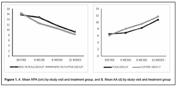 NPA has improved significantly in the flipper group after 4 weeks of treatment when compared to the PLRA group. There is no significant difference in outcomes of both treatment groups after 12 weeks of treatment but improvement is fast in the flipper group when compared to the PLRA group. There is a significant improvement in AA in the flipper group after 4 weeks of treatment when compared to the PLRA group. There is no significant difference in outcomes of both treatment groups after 12 weeks of treatment but improvement is fast in the flipper group when compared to the PLRA group (Figure 1).