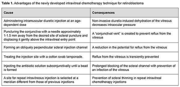 Discussion Best practice for safe IVitC includes a number of measures. Preoperative diagnostic assessment should include meticulous ophthalmoscopic examination and sonographic examination to localize tumor foci, assess dissemination of vitreous seeds, and select a tumor-free site with no vitreous seeding for IV injection [2, 6, 7, 15, 17]. Next, measures should be taken to prevent tumor cell dissemination during IVitC. The IVitC technique for RB developed by Munier and colleagues [13] appears to be the closest to ours and is described briefly below. First, they create a transient hypotony by an anterior chamber paracentesis, aspirating the same volume (0.1-0.15 mL) as the one to be injected into the vitreous. Second, a 32G needle mounted on a tuberculin syringe is introduced perpendicularly 2.5–3.5 mm from the limbus at the desired meridian opposite the seeds through the conjunctiva and sclera under microscope viewing until the needle tip reaches the center of the vitreous cavity. Third, upon removal of the needle three cycles of freeze and thaw cryoapplications are given at the injection site. Finally, the eye is carefully shaken with a forceps in all directions to enable even distribution of the drug in the vitreous. We believe that the IVitC technique of Munier and colleagues has the disadvantages as follows. First, the technique includes additional intraocular manipulation (anterior chamber paracentesis) in an eye with an intraocular tumor. This makes the intravitreal injection technique more difficult due to ocular hypotony and anterior shift of the iridolenticular diaphragm, leading to changes in the intraocular topography. Second, numerous IVitC-related paracenteses contribute to a decrease in anterior chamber depth, formation of anterior synechiae, anterior chamber angle closure, and potential development of secondary glaucoma. Third, introducing the injection needle perpendicularly to the surface of the globe may result in reflux from the vitreous cavity. Fourth, three cycles of freeze and thaw cryoapplications given at the injection site will result in an increase both in the operative time and in postoperative inflammation, creating the conditions for local thinning of the sclera, which is especially relevant to the case of repeated IV injections. Finally, three scleral cryoapplications at the pars plana ciliaris may lead to further ciliary atrophy and progressive progressive hypotony, especially in repeated injections. In the IVitC technique developed by us (Patent of Ukraine No. 144,595 issued 12.10.2020, Bulletin No. 19) [17], ocular hypotony is achieved by preoperative application of intramuscular injection of a diuretic, whereas reflux from the vitreous cavity is prevented by the following measures: displacing the conjunctiva above the intravitreal entry point; forming an obliquely perpendicular injection channel; treating the site of scleral puncture with cotton swab tamponade and applying antibiotic solution subconjunctivally, which also prevents an infection of the vitreous; and selecting different meridians for repeat IVitC to prevent scleral thinning. The above measures enable improving the IVitC technique for RB, advancing prevention of tumor cell dissemination during IVitC, and decreasing the risk of perioperative and postoperative complications after IVitC for RB (Table 1). Therefore, compared with the IVitC technique for RB developed by Munier and colleagues [13], our technique has the following distinctive features: (1) Creating hypotony preoperatively in a non-invasive way; (2) Preventing reflux from the vitreous cavity by: (a) Puncturing the conjunctiva with a needle approximately 1-1.5 mm away from the desired site of scleral puncture and displacing it gently above the intravitreal entry point; (b) Forming an obliquely perpendicular scleral injection channel; (c) Applying cotton swab tamponade of the site of injection upon removing the needle; (d) Injecting the antibiotic solution beneath the conjunctiva at the site of injection until a bead is formed; (3) Decreasing the risk of perioperative and postoperative complications after IVitC for RB due to rejecting the use of additional manipulations (an anterior chamber paracentesis and cryoapplications at the injection site) and selecting a site for repeat IVitC injection at a meridian different from those of previous injections. Conclusion The developed IVitC technique for intraocular RB is minimally invasive, easy to use and prevents perioperative and postoperative complications. High ablastic capacity was achieved by reducing reflux from the vitreous, and confirmed by the absence of extrabulbar tumor spread, tumor recurrence in the orbit, and remote metastasis. Conflict of Interest Statement. The authors declare no conflict of interest. Funding Support. There are no external sources of funding. References 1.Bobrova NF, Naumenko VO, Sorochynska TA, Tronina SA, Dembovetska GM. [Diagnostic assessment and treatment of children with retinoblastoma, a malignant retinal tumor: a protocol]. Oftalmol Zh. 2012;1:80-4. Russian. 2.Bobrova NF, Sorochynska TA. [Combined (intravitreal and intravenous) polychemotherapy in organ-preserving treatment for retinoblastoma. Oftalmol Zh. 2011;2:38-44. Ukrainian. 3.Ericson LA, Rosengren BH. Present therapeutic resources in retinoblastoma. Acta Ophthalmol. Acta Ophthalmol (Copenh). 1961;39:569-76. 4.Frederici TJ. Intravitreal injections: AAO's Focal Points. Clinical Modules for Ophthalmologists. 2009;27(8, module 2):1–12. 5.Ghassemi F, Khodabande A. Risk definition and management strategies in retinoblastoma: current perspectives. Clin Ophthalmol. 2015 Jun 8;9:985-94. 6.Seregard S, Kock B, Trampe E,Seregard S. Intravitreal chemotherapy for recurrent retinoblastoma in an only eye. Br J Ophthalmol. 1995 Feb;79(2):194-5. 7.Shields CL, Manjandavida FP, Arepalli S, et al. Intravitreal melphalan for persistent or recurrent retinoblastoma vitreous seeds: preliminary results. JAMA Ophthal