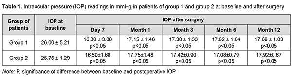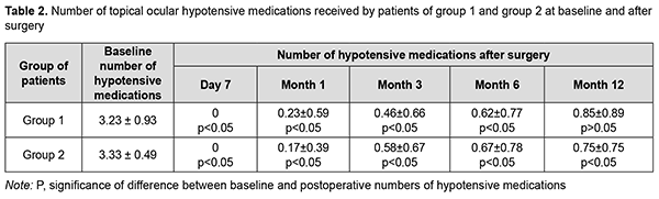 There was a significant difference between preoperative and any postoperative IOP levels at any time point (р< 0.05) for either group. In addition, there was no significant difference in IOP between groups (р> 0.05) at any time point. Mean numbers of ocular hypotensive medications used for group 1 and group 2 were 3.23 ± 0.93 and 3.33 ± 0.49, respectively, preoperatively (with no significant difference between groups, р> 0.05), 0 and 0, respectively, at day 7; 0.23 ± 0.59 and 0.17 ± 0.39, respectively, at month 1; 0.46 ± 0.66 and 0.58 ± 0.67, respectively, at month 3; 0.62 ± 0.77 and 0.67 ± 0.78, respectively, at month 6; and 0.85 ± 0.89 and 0.75 ± 0.75, respectively, at month 12 (Table 2).