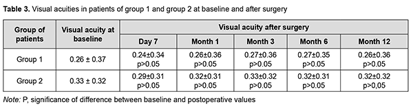 There was a significant difference between preoperative and any postoperative mean numbers of hypotensive medications used at any time point (р< 0.05) for either group. In addition, there was no significant difference in mean numbers of hypotensive medications used between groups (р> 0.05) at any time point. In group 1, of 13 patients, 7, 2 and 3 patients used 4, 3 and 2 hypotensive medications, respectively, preoperatively, and 3, 4 and 6 patients used 1, 2 and no hypotensive medications, respectively, at month 12. In group 2, of 12 patients, 4 and 8 patients used 4 and 3 hypotensive medications, respectively, preoperatively, and 5, 2 and 5 patients used 1, 2 and no hypotensive medications, respectively, at month 12. There was no significant difference between preoperative and postoperative visual acuity (р< 0.05) for either group (Table 3).
