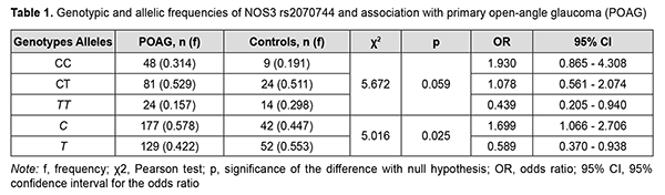 Introduction It is estimated that roughly 60.5 million people had glaucoma in 2010 and that this number is increasing [1]. In addition, it is estimated that, in 2019, 11.9 million people globally had moderate or severe vision impairment or blindness due to glaucoma, diabetic retinopathy and trachoma that could be prevented [2]. Wang and colleagues [3, 4] aimed to evaluate the trends and variations in global health burden of glaucoma by year, age and sex, region and socio-economic status, using disability-adjusted life years (DALYs). They found that, from 1990 to 2015, the DAILY number increased by 122%, and both male and female showed similar increasing trend with ageing, with the peak at 60 years old. In 2013, the number of people (aged 40-80 years) with glaucoma worldwide was estimated to be 64.3 million, increasing to 76.0 million in 2020 and 111.8 million in 2040 [5]. According to the American Optometric Association, primary open-angle glaucoma (POAG) develops slowly and usually without symptoms, and is the most common type of glaucoma [6]. The global prevalence of glaucoma for population aged 40-80 years is 3.54% (95% CI, 2.09-5.82) [7]. Black populations showed highest POAG prevalence, with 5.2% (95% credible interval (CrI) 3.7%, 7.2%) at 60 years, rising to 12.2% (95% CrI 8.9% to 16.6%) at 80 years. Increase in POAG prevalence per decade of age was greatest among Hispanics (2.31, 95% CrI 2.12, 2.52) and White populations (1.99, 95% CrI 1.86, 2.12) [8]. As early as 1994 Flammer described primary vascular dysregulation as a condition that transiently impairs adaptation of blood flow to the needs of the respective tissue [9]. Endothelial dysfunction plays a special role in the pathogenesis of glaucomatous optic neuropathy (GON; a specific damage to ganglious neurons and their axons) in POAG [10]. The endothelial vasoactive factors that can provoke vasoconstriction and optic nerve ischemia (nitric oxide (NO), endothelein, prostacyclin, etc.) play a role in the development of GON [10, 11]. The vascular endothelium, a monolayer of endothelial cells, constitutes the inner cellular lining of vessels, and regulates vascular tone and permeability, rheological properties of blood and homeostasis, proliferation of pericytes and vascular cells, fibrinolysis and inflammation [12, 13]. A functionally intact endothelium is characterized by its ability to secrete NO from L-arginine by the enzyme entodthelial NO synthase (eNOS; NOS3) [14]. NO is a lipophilic molecule produced at picomolar amounts, easily diffuses across cell membranes to myocytes, where it activates guanylate cyclase, producing cyclic guanosine monophosphate (cGMP) [15]. The latter acts as a messenger molecule in blood vessel dilation via the interaction with a specific protein kinase, which reduces the free Ca2+ level in myocytes [16]. It has been established that a significant proportion (20% to 60%) of cases of POAG are genetically determined [17, 18]. The NOS3 gene is located in chromosome 7q36.1. The rs2070744 (T-786C) variant is located in the promoter of the gene and among others has been shown to be promising for association with POAG [19]. The results of a study by Emam and colleagues (2014) [20] suggested that the CC genotype of T-786C NOS3 (rs2070744) may be associated with an increased risk of developing high-tension POAG in Egyptians, particularly, women. Kang and colleagues (2011) [21] showed that the association between hypertension and POAG depended on T-786C SNP variants, thus confirming the important role of vascular disease in the development of POAG. The purpose of this study was to identify an association between POAG and the rs2070744 (T-786C) variant in the NOS3 gene in a Ukrainian population. Material and Methods We examined 200 patients, including 153 patients (153 eyes) diagnosed with POAG (the study group) and 47 patients (47 eyes) without POAG (the control group). The study group included 57 men (37.25%) and 96 women (62.75%) with a mean age of 65.0 ± 13.1 years and disease duration of 4.9 ± 5.3 years, and the control group, 22 men (46.81%) and 25 women (53.19%), with no significant difference (р = 0.241) in gender between the groups. Patients underwent an examination according to the common protocol [3]; this included visual acuity testing, Humphrey perimetry, refractometry, intraocular pressure (IOP) measurement, biomicroscopy, gonioscopy, ophthalmoscopy, and ocular coherence tomography (OCT). In the study group, measurements in the affected eye were taken for the analysis and included best-corrected visual acuity (BCVA), IOP (mmHg), visual field mean deviation (MD; dB) and pattern standard deviation (PSD; dB), and OCT-derived peripapillary retinal nerve fiber layer (RNFL) thickness (µm), ganglion cell complex (GCC) thickness (µm), and Cup/Disc Area Ratio. In addition, a 3-ml venous blood sample was taken for genetic testing. Ethical approval was gained from the Ethics Committee of Dnipro State Medical University (protocol No. 6 of October 4, 2019). The study followed the ethical standards stated in the Declaration of Helsinki, the European Convention on Human Rights and Biomedicine and the Order of the Ministry of Health of Ukraine No. 690 dated September 23, 2009, "On Approval of the Procedure for Conducting Clinical Trials of Medicinal Products and Expert Evaluation of Materials Pertinent to Clinical Trials and Model Regulations of the Ethics Committee". Genotypes were determined by real-time polymerase chain reaction (PCR) using Gene Amp® 7500 PCR System (Applied Biosystems, Foster City, CA). At the first phase of the study, DNA extraction from venous blood was done using the Invitrogen™ PureLink Genomic DNA Kit for Purification of Genomic DNA (Invitrogen Inc.) following the manufacturer’s instructions. Mutation detection and quantification were performed using TaqMan Mutation Detection Assays (Life Technologies, Carlsbad, CA). Statistical analyses were performed using Statistica 10 softw