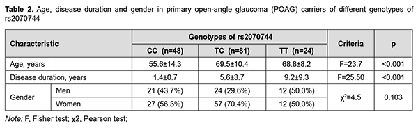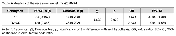 Carriers of the heterozygous genotype showed an intermediate position between carriers of the homozygous genotypes with regard to eye examination results, which in our opinion suggested a pathogenetical role of the C allele of rs2070744. This was confirmed by the inheritance model analysis which demonstrated the significance of the recessive model (СС+СТ vs ТТ; р = 0.032), but not the dominant model (СС vs СТ+ТТ; р = 0.105). In addition, it was demonstrated in the recessive model (Table 4) that patient carriers of the ancestral C allele (СС+СТ genotypes) are at a higher risk of POAG compared to patient carriers of the homozygous TT genotype (р = 0.032), whereas carriers of the minor homozygous TT genotype are at a 2.3-fold lower risk compared to carriers of the СС and СТ genotypes (р = 0.032).