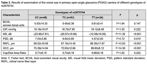 Compared to patient carriers of the ancestral C allele of rs2070744, patient carriers of the minor Т allele were 7.4 years older (p < 0.001; 69.3 ± 9.6 years versus 61.9 ± 14.4 years), and had 3.7 years longer disease duration (7.0 ± 6.6 years versus 3.3 ± 3.3 years; p < 0.001). There was no statistically significant difference (р = 0.103) between patients with POAG and controls regarding genotype frequency distribution stratified by gender. In addition, stratification by gender showed no association of SNP rs2070744 with POAG, with genotypic and allelic p values being р = 0.413 and р = 0.159, respectively, for men, and р = 0.122 and р=0.080, respectively, for women. There were certain differences among patient carriers of different genotypes with regard to eye examination results (Table 3). In general, patient carriers of the TT genotype exhibited a less severe disease course than carriers of other genotypes. Thus, eyes of patient carriers of the TT genotype showed 11.77 to -8.49 db (p<0.001) and 2.27 to 2.97 db (р = 0.010) better perimetric MD and PSD, respectively, and 18.87 to 21.21 µm (p < 0.001) and 14.41 to 17.17 µm (p < 0.001) thicker RNFL and GCC, respectively, compared to eyes of carriers of other genotypes.