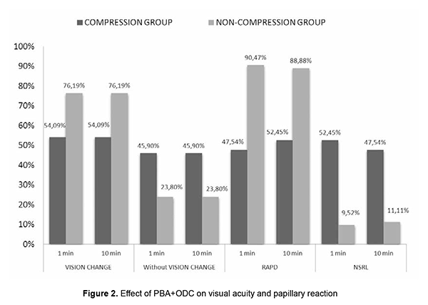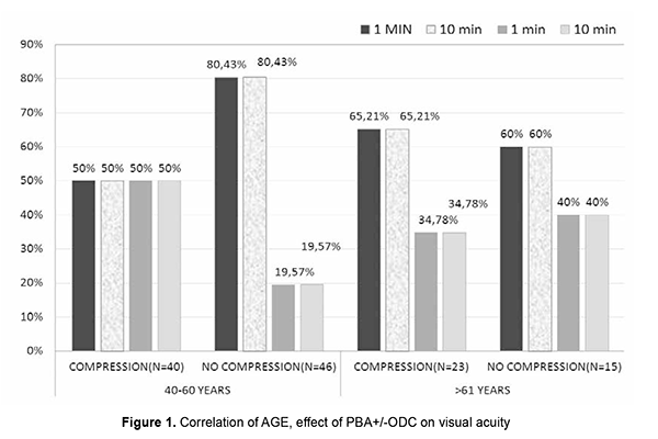Out of 40 patients of the PBA+ODC group of 40-60 yrs age group, 20 cases had RAPD, 20 cases had NSRL in 1 min, 23 cases had RAPD, 17 cases had NSRL after 10 min. This indicates that after 10 minutes of compression, three patients developed RAPD from the NSRL batch. Out of 37 patients of >61 yrs., 21 cases were given PBA+ODC and 16 cases were given PBA only without ODC. In the compression group, out of 21 patients, 9 cases had RAPD, and 12 cases had NSRL after 1 min and 10 min. Out of 37 patients of>61 yrs age, 16 cases were given PBA only without ODC, 15 cases had RAPD, and 1 case had NSRL after 1 min and 10 min. In our study, out of 124 patients, 61 cases were given by PBA+ODC, PBA gave 63 cases only without compression. Out of 61 (PBA+ODC) cases, vision drop was seen in 33 (54.09%) after 1min, and 28 (45.91%) patients have no change in the vision after 1 min and 10 min. Out of 61 patients (PBA+ODC) cases, 29 (47.54%) subjects had RAPD after 1min, 32 (52.45%) subjects had RAPD after 10 min, 32 (52.45%) cases had NSRL after 1 min, 29 (47.5%) cases had NSRL after 10 min. In the PBA+ODC group, 54.09% had vision drop. These 29 cases had RAPD after 1 min, 32 patients had RAPD after 10 min. Thirty-two cases had NSRL after 1min, 29 cases had NSRL after 10 min. This implies during 10 min compression, there is an appearance of RAPD in the previously NSRL eye (Fig. 2).