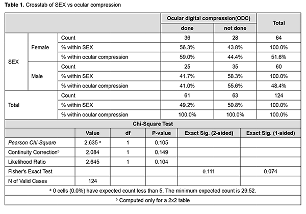 N = z12 1 - α/2 p (1-p) d Where, p = expected proportion; d = absolute precision; 1 - α/2 = desired confidence level; P = 0.6; Preci d=10; 1-α/2 = 95. Required sample (N) = 124 Inclusion criteria are patients undergoing cataract surgeries; patients who had no history of previous ocular surgeries; patients with normal pupillary reactions. Exclusion criteria are patients with diabetic retinopathy, patients with any neuro-ophthalmology disorder, any disease involving the retina & optic nerve, patients with a history of Glaucoma, coexisting ocular pathologies, and complicated cataracts are excluded. Method. All cases that met inclusion criteria were taken, and informed written consent was obtained. The same investigator recorded all the variables in the study to minimize bias. We divided the patients into two groups: peribulbar block given with no ocular digital compression, and the second group was given ocular compression followed after PBA. Examination. The patients' visual acuity was measured with a standard Snellen chart at 10 feet, and an afferent pupil defect is examined using the reverse swinging Marcus Gunn test, with a bright pen torch, binocular loupe. The eye was dilated with phenylephrine 5%w/v, and tropicamide 0.8% w/v. Dosage. We used 10 ml injection, out of which 5 ml is lidocaine, 5ml is bupivacaine, and 75 units of hyaluronidase. The patient received 2% lignocaine hydrochloride 5 mL (LOX 2%; Neon Pvt. Ltd, Mumbai, India), 0.75% bupivacaine 5 mL (ANAWIN 0.5%; Neon Pvt. Ltd, Mumbai, India), and hyaluronidase 75 IU/mL injection (Hynidase; Shreya Life Sciences, Aurangabad, India) for the peribulbar block. The needle was first inserted with 5 ml of local anaesthetic solution through the eyelid at a point between the lateral third and medial two-thirds of the lower orbital margin, with the bevel facing the globe. The second injection was given in the superomedial compartment. The needle was introduced through the upper lid at about 2 mm medial and inferior to the supraorbital notch. The needle was then advanced in a sagittal plane under the orbit roof for a maximal depth of 25 mm, where the remaining 5 mL of local anaesthetic was injected at a similar rate as for the inferior injection. Injection of the local anaesthetic was stopped when there was either firmness in the globe or any resistance to further depressing the syringe's plunger. For group 1, the globe was compressed gently with the middle three fingers placed over the sterile gauze pad on the upper eyelid with the middle finger pressing directly down on the eyeball. Every 30 seconds, digital pressure was released for 5 seconds to allow for the vascular pulsations to occur. Following this compression, vision and pupillary reactions were noted after 1 min, and 10 mins post anaesthesia. For group 2, the globe was not compressed. Visual acuity and RAPD were measured in both groups. Routine monitoring for all patients included electrocardiogram, non-invasive arterial pressure monitoring, and pulse oximetry. Both the block and digital compression were performed by an ophthalmologist (primary investigator) throughout the study. Statistical analysis. The results were recorded using spreadsheets, statistical analysis performed by software SPSS (Statistical Package for the Social Science) software version 22. Descriptive measures like mean, standard deviation, and range were calculated for all parameters. Analysis was performed using paired t-test, unpaired t-test, and chi-square test. A p-value ≤of 0.05 has been considered statistically significant. Ethical consideration. The authors confirm that ethical approval was obtained for the study from Sankar Foundation Eye Institute Ethics Committee, Visakhapatnam, India. Results Eighty-seven cases belonged to 40-60 years, and 37 cases belonged to > 61 years of age groups. There were 64 (51.61%) female and 60 (48.3%) male patients included (Table 1). Among the 40-60 years of age group, 40 (45.97%) patients were given PBA and ODC, and another 47 (54.02%) patients were given PBA only without ODC. Out of 37 patients, 21 (56.75%) cases were given PBA and ODC, and 16 (43.24%) were given PBA only without ODC. Out of 64 female patients, 36 (56.3%) subjects were given PBA and ODC and 28 (43.8%) cases were given PBA only without ODC. Out of 60 male patients, 25 (41.7%) were given PBA and ODC, and 35 (58.3%) were given PBA only without ODC (Table 2).