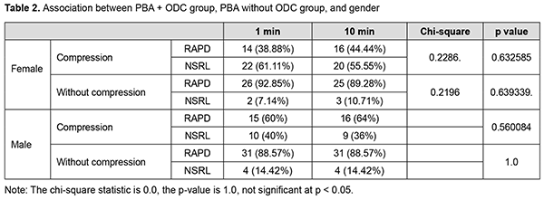 Effect of PBA + Ocular digital compression (ODC) on pupillary reactions Out of 64 females, 36 were given ocular compression, 28 were without compression (Table 3). After 1 min post anaesthesia, 14 (38.88%) cases had RAPD and 22 (61.11%) cases among of 36 had NSRL. After 10 minutes post anaesthesia, 16 (44.44%) had RAPD and 20 (55.55%) among of 36 had NSRL.