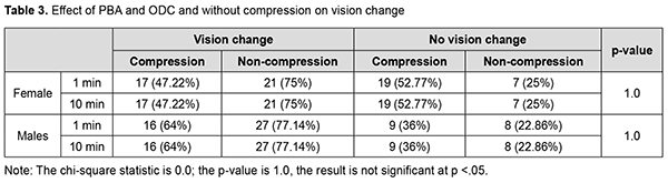 Association of PBA + ODC and PBA without ODC on vision change Out of 64 females, 36 cases were given PBA+ODC and 28 cases were given PBA only + without ocular compression. 17 (47.22%) subjects had vision drop among 36 female patients in the compressive group. Out of 28 non-compressive females, 21 (75%) had a drop in the vision and 7 (25%) had no change in the vision after 1 min and 10 min post anaesthesia. Out of 60 males, 25 cases were given PBA+ODC and 35 cases were given PBA only without compression. 16 (64%) subjects had vision drop after 1minute and 10 min postanaesthesia among compressive male patients. 27 (77.14%) cases had vision drop after 1minute and 10-minute post anaesthesia among non-compressive male patients (Fig. 1).