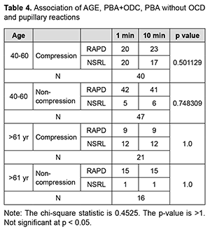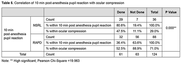 Effect of PBA + without compression on pupillary reactions Out of 64 females, 28 patients were given only PBA without ODC. After 1 minute post anaesthesia, 26 (92.85%) cases had RAPD, and 2 (7.14) cases had NSRL. After 10 minutes post anaesthesia, 25 (89.28) subjects had RAPD, and 3 (10.71%) cases had NSRL. Out of 60 male subjects, 25 patients were given PBA and ODC, 35 cases were given PBA only without ODC. After 1 minute post anaesthesia, 15 (60%) had RAPD, and 10 (40%) had NSRL among of 25 in group 1. After 10 minutes post anaesthesia, 16 (64%) had RAPD, and 9 (36%) had NSRL in group 1. Out of 60 males and 35 cases were given PBA only without ODC. In these 35 cases of group 2, after 1 minute post anaesthesia, 31 (88.57%) had RAPD, and 4 (14.42%) had NSRL. After 10 minutes post anaesthesia, 31 (88.57%) had RAPD and 4 (14.42%) had NSRL in group 2 (Table 4).