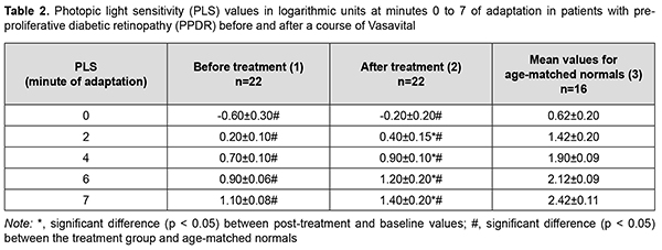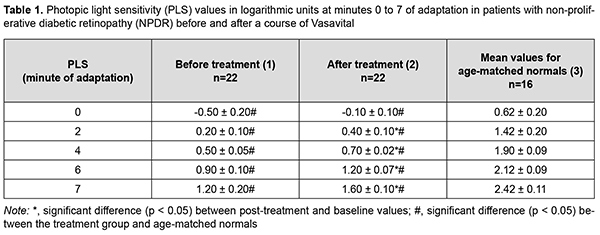 Pretreatment photopic light sensitivity threshold values were two-fold to 7.1-fold decreased compared to controls (p < 0.05; Table 1). After treatment, photopic light sensitivity threshold values for patients with NPDR significantly improved, but were 1.5-fold to 3.6-fold decreased compared to controls (p < 0.05; Table 1). After a course of Vasavital treatment, photopic light sensitivity of patients with PPDR increased twofold (p < 0.05) at minute 2, 28.5% (p < 0.05) at minute 4, 33.3% (p < 0.05) at minute 6, and 27.2% (p < 0.05) at minute 7 of adaptation (Table 2). Pretreatment photopic light sensitivity threshold values for patients with NPDR were 2.2-fold to 7.1-fold decreased compared to controls (p < 0.05; Table 2). After treatment, photopic light sensitivity threshold values for patients with PPDR significantly improved, but were 1.7-fold to 3.6-fold decreased compared to controls (p < 0.05; Table 2).