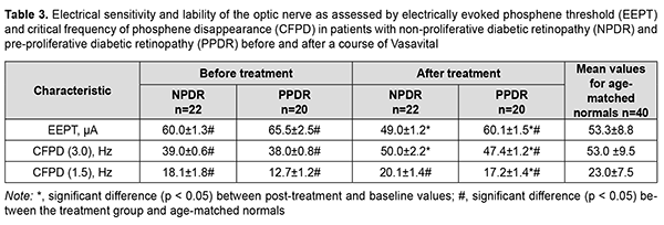 Background: Diabetic retinopathy (DR) is a major cause of visual impairment or blindness among working-age adults worldwide. For years, researchers around the world have been trying to develop new effective pharmaceutical methods of treatment for preclinical and early DR. Purpose: To examine the effect of a one-month course of Vasavital on the function of the visual system and ocular hemodynamics (using ophthalmic rheography) in patients with non-proliferative and proliferative diabetic retinopathy (NPDR and PPDR, respectively). Material and Methods: Forty-seven type 2 diabetes patients with DR and moderate glycemic control were divided into those with NPDR (group 1 of 15 patients; 30 eyes) and those with PPDR (group 2 of 17 patients; 34 eyes). The control group was composed of 15 volunteers (30 eyes) of similar age having no systemic or eye disease. Patients received a one-month course of Vasavital-only therapy at a dose of one capsule twice a day as an outpatient treatment. They received visual acuity assessment, intraocular pressure measurement, ophthalmoscopy, biomicroscopy, perimetry, systemic blood pressure and pulse measurement, optical coherence tomography and fluorescein angiography, and ocular hemodynamics was assessed by ophthalmic rheography. Eleven patients (22 eyes) with NPDR and ten patients (20 eyes) with PPDR underwent electrophysiological studies of electrically evoked phosphene threshold (EEPT) and critical frequency of phosphene disappearance (CFPD), before and after a course of Vasavital treatment. Results: Patients reported that a one-month course of Vasavital was well-tolerated, with no new complaints. In addition, no side effects were observed. After treatment, the function of the photopic afferent system as assessed by light sensitivity at minutes 0 to 7 of adaptation improved by 33.3%-40% in patients with NPDR and by 27.2%-33.3% in patients with PPDR. In addition, there was a decrease in EEPT by 18% and 7.7%, respectively, and an increase in CFPD by 28.2% and 24.7%, respectively, for patients in groups 1 and 2. Moreover, ocular pulse blood filling improved by 27.7% in patients with NPDR and by 17.3% in patients with PPDR, and vascular tone in large-caliber vessels decreased by 8% in the former patients. Conclusion: A one-month Vasavital course administered to patients with DR had a positive effect on the visual system function and ocular circulation parameters, which provides grounds for the use of the Ginkgo biloba-based preparation as a monotherapy or as part of a combined treatment for initial functional changes in the visual system in DR. Keywords: diabetic retinopathy, Vasavital, visual system function, ophthalmic rheography