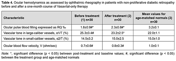 Critical frequency of phosphene disappearance reflects the function of the axial bundle of the optic nerve. The determination of CFPD with the current strength increased to 300% 150% of phosphene threshold (i.e., CFPD1.5) is considered a more sensitive method [13]. After treatment, CFPD1.5 for patients in group 1 did not change substantially, and for patients in group 2 increased by 4.5 Hz (35%; p < 0.05) (Table 3), indicating that the function of the axial bundle of the optic nerve in the former patients was rather good, and the conductivity of the axial bundle of the optic nerve in the latter patients improved. However, after treatment, CFPD1.5 for patients in group 1 and group 2 was 13% lower (p < 0.05) and 25% lower (p < 0.05), respectively, compared to controls (Table 3). Therefore, our electrophysiological studies demonstrated that, after treatment, there was a decrease in electrically evoked phosphene threshold by 18% and 7.7%, respectively, and an increase in CFPD by 28.2% and 24.7%, respectively, for patients in groups 1 and 2, and an increase in CFPD1.5% by 35% for patients in group 2. This reflects an improved function of the inner retina and the axial bundle of the optic nerve in both groups of patients with treatment. All patients underwent ophthalmic rheography study before and after treatment to determine changes in their ocular hemodynamics. In patients of group 1, OPBF (expressed as RQ, ‰ rheographic coefficient) was 1.8 ± 0.9‰ at baseline (which was 43.8% lower than in age-matched normals, p < 0.05) (Table 4), and increased to 2.3 ± 0.6 ‰ (by 27.7%, p < 0.05) and was still lower than in age-matched normals after a one-month course of Vasavital (Table 4).