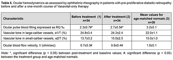 In patients of group 2, OPBF (expressed as RQ, ‰ rheographic coefficient) was 2.3 ± 0.7‰ at baseline (which was 28.1% lower than in age-matched normals, p < 0.05), and increased by 17.3% (p < 0.05) after treatment (Table 5).