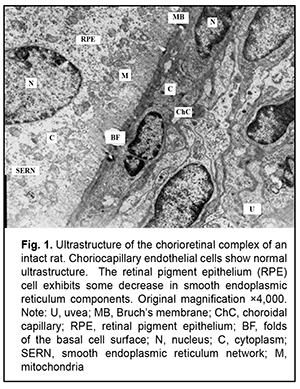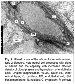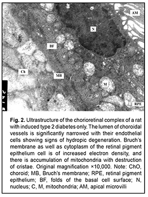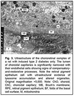 Introduction The clinical and morphological picture of diabetic microangiopathy is rather specific. Of all the vascular complications, diabetic nephropathy and retinopathy are worthy of the most attention [1]. Diabetic nephropathy is one of the most severe complications of type 2 diabetes, because it can lead to progressive renal dysfunction and chronic renal failure, with patients having an irreversible and even pessimistic prognosis [1, 2]. Another organ vulnerable to hyperglycemia is the eye, with diabetic retinopathy being the most dangerous diabetic ocular complication leading to impaired vision and blindness [3-6]. Capillary microocclusion and hyperpermeability contribute to this pathological process. Under these circumstances, blood retinal barrier breakdown develops, with subsequent growth of vessels and pathological connective tissue leading to massive hemorrhage and retinal detachment [7]. Metabolic alterations and hemodynamic factors leading to ischemia are preceded by changes at the cellular level that affect microcirculations and angiogenesis [4, 8-10]. The retina is the most commonly affected. Because the retina is metabolically highly active, ischemia may lead to irreversible damage to retinal neural elements and choroidal capillaries. Neurodegeneration is accompanied by neuronal apoptosis, glial dysfunction and an increased vascular permeability [3, 10]. The percentage of choroid with focal choriocapillaris degeneration in diabetic choroids had been found to be more than 4-fold greater than that in nondiabetic choroids [11]. Polymorphonuclear leukocytes contribute to vaso-occlusive processes and endothelial cell injury in the diabetic choroid [12]. The presence of leukocytes in the lumen indicates uveal inflammation [3]. It is noteworthy that choroidal and retinal capillaries are structurally and functionally similar to those of the intestinal mucosa and renal tissue [13, 14]. Consequently, the purpose of this study was to assess vascular ultrastructural changes in the choroid, retina, and renal glomerular and tubular system in a rat model of pyelonephritis in the presence of type 2 diabetes. Material and Methods Samples were obtained from 95 Wistar rats divided into three groups: group 1 (or control group) of 30 intact animals; group 2 of 15 animals with type 2 diabetes induced by intraperitoneal streptozotocin 15.0 mg/kg for 5 consecutive days; and group 3 of 50 animals with acute pyelonephritis in the presence of type 2 diabetes (streptozotocin 35.0 mg/kg on 2 days spaced by a week). Acute pyelonephritis was induced by Escherichia coli administration (107 CFU/kg) rectally. All animal experiments were performed in compliance with the Law of Ukraine on Protection of Animals from Cruel Treatment No. 3447-IV and European Convention for the Protection of Vertebrate Animals Used for Experimental and Other Scientific Purposes from the European Treaty Series (Strasbourg, 1986), and approved by a local Bioethics Committee of the Filatov Institute. For electron microscopy, tissue samples were fixed in 2.5% glutaraldechyde in phosphate buffer at pH 7.4 and post-fixed in 1% osmic axid in phosphate buffer at pH 7.4. Sections were dehydrated with ascending grades of alcohol and embedded in Epon-araldite mixture. Ultrathin sections of rat choroidal, retinal and renal glomerular-and-tubular tissue were cut, stained with Reynolds’ lead citrate [15], and examined in a PEM-100-01 electron microscope [15]. Results Ultrastructural features of choroidal and retinal vessels Choroidal tissue samples of rats with induced type 2 diabetes appeared edematous. The lumen of most vessels and capillaries was narrowed due to large swollen endothelial cells. At other sites, the lumens of normal diameter were filled with red blood cells. The ultrastructure of endothelial cells of the choriocapillaris was heterogeneous: some cells showed normal structure, whereas others showed signs of hydropic degeneration. In addition, there were sites with signs of compensatory-and-restorative processes, with increased amount of cytoplasmic organelles and hypertrophic nucleus with diffuse heterochromatin. It is noteworthy that fenestrations were well seen at the thinned cytoplasmic sites of endothelial cells, and solitary microvilli were seen at the luminal surface of these cells. However, lumens of vessels and capillaries contained structures of increased electron density which were visualized at the Bruch's membrane. This indicated blood retinal barrier breakdown, which facilitated diffusion of substances via RPE cell membranes. This in turn indicated altered permeability of cytoplasmic membranes of choriocapillary endothelial cells and RPE cells. We observed heterogeneous changes in RPE cells. Focally, there were cells with normal structure, whereas others exhibited hyaloplasm and karyoplasm of increased electron density and some altered mitochondria. In addition, there were cells with signs of compensatory-and-restorative processes. Each of the latter cells had two nuclei with dispersed chromatin, high number of mitochondria and focal ultrastructural evidence of altered smooth endoplasmic reticulum components and lysosome accumulation. It is noteworthy that the basal surfaces of RPE cells showed the absence of or poorly developed folds at some sites, indicating impaired transport processes between the chorioretinal complex and RPE cells (Figs. 1, 2 and 3).