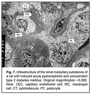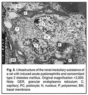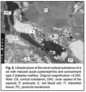 The ultrastructure of the renal cortical substance in rats with induced acute pyelonephritis and concomitant type 2 diabetes (Fig. 5) shows structurally deformed and narrowed capillaries with altered capillary endothelial cells, red blood cell sludge and no cytopodia at an extensive site. The Bowman’s space was seen bridged by hypertrophied podocytes. Renal cortical substance of the rats of this group exhibited destruction of the podocytes of the inner and outer leaflets, destruction of glomerular capillary epithelial cells and sludge of capillary red blood cells. In addition, there was no Bowman’s space and destruction of organelles of proximal tubule epithelial cells and interstitial tissue cells was seen (Fig. 6). Ultrastructure of the medullary substance of rats with induced acute pyelonephritis and concomitant type 2 diabetes showed hydropic changes and destruction of organelles in cytotrabecules and endothelial cells of nephron capillary networks with focal cytopodial destruction (Fig. 7). It is noteworthy that reduced capillary filling and hypertrophied podocytes under destruction were characteristic for the medullary substance of the rats of this group (Fig. 8). Therefore, summing up, rats with induced acute pyelonephritis and concomitant type 2 diabetes exhibited renal glomerular capillaries with endothelial cells of increased electron density, a large round nucleus and swollen mitochondria. Glomerular capillaries appeared structurally deformed, nodular and focally significantly narrowed or collapsed. The capillary lumens were filled with red blood cells. Unlike the glomerular capillaries of intact animals, those of rats with induced acute pyelonephritis and concomitant type 2 diabetes contained endothelial cells of increased electron density, a large round nucleus and swollen mitochondria. Some capillary endothelial cells showed signs of hydropic degeneration, with red blood cells, either individual or forming clumps or sludge in capillary lumens. In addition, fenestrations in these endothelial cells were poorly determined. Other capillaries were of normal structure or their endothelial cells had focal loss of organelles with signs of cytoplasmic matrix swelling and cell hypertrophy (Fig. 5). A portion of capillaries appeared structurally deformed and narrowed. In many capillaries, endothelial cells were either absent or necrosed. A portion of these cells had round nuclei with nuclear membrane invaginations and folds, and chromatin appeared almost destroyed (Figs 5 and 6). It is noteworthy that structural and functional alterations of renal vascular endothelial cells caused significant changes primarily in the surrounding podocytes. We noted also homogenization of the basal membrane and extensive mesangial cell growth. Podocytes of the outer leaflet had a cytoplasm of high electron density, others had a hypertrophied nucleus and were irregularly shaped, and a portion of podocytes was under destruction. Many podocytes showed increased size and their cytoplasm appeared light and swollen. Cytoplasmic organelles of podocytes and podocyte pedicles showed various degrees of destruction. Some of these cells appeared empty (Figs 5 and 6). Discussion In hyperglycemia, pathological changes (e.g., diabetic nephropathy [2, 16, 17] and retinopathy) develop in many organs and body systems, resulting in complex functional alterations in these organs [3-6]. In the current study, the ultrastructural changes in the retinal and uveal vascular systems were of a similar type to those in the renal glomerular-and-tubular system in rats with type 2 diabetes. We found that induced acute pyelonephritis and concomitant type 2 diabetes caused more severe ultrastructural changes in the kidneys than in the retina, with the most significant ocular vascular changes and renal vascular changes found in endothelial cells. These changes included findings of vacuolar degeneration in some endothelial cells and capillary basal membrane thickening. There was focal necrosis of individual epithelial cells. Vessel lumens appeared focally narrowed or expanded, with red blood cells forming clumps or sludge in lumens. Some capillaries were obliterated. These changes obviously caused secondary changes in the surrounding structures. Common ocular changes included focal destruction in RPE cells, destruction of retinal photoreceptor inner segments and choroidal stromal edema. Common renal changes included destruction of the podocytes of the glomerular capillary network and homogenization of basal membrane, with the cortical portion of the kidneys being more sensitive to the pathogenic effect of streptozotocin than the kidney medullary substance, which results in persistent hyperglycemia. Thus, there were structural alterations in renal cortical parenchyma with morphological manifestations of early mesangial cell apoptosis, and the changes in the renal medullary layer were consistent with acute infectious inflammation in rats with induced pyelonephritis in the presence of type 2 diabetes [18]. Conclusion In the current study, electron microscopy micrographs demonstrated the ultrastructural changes in the retinal and uveal vascular systems which were of a similar type to those in the renal glomerular-and-tubular system in rats with experimental pyelonephritis in the presence of type 2 diabetes.