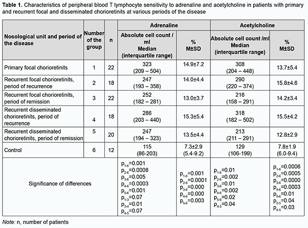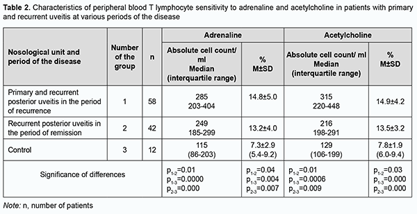 Material and Methods: One hundred patients with idiopathic posterior uveitis were examined at different phases of the disease. The control group was composed of 16 healthy individuals of a similar age. The specific sensitivity of lymphocytes to neuromediators, adrenaline and acetylcholine (expression of T cell adrenergic and acetylcholine receptors) was assessed using our complex methodology (in conjunction with a parallel sampling method) for assessing the individual’s sensitivity to medicaments (biological regulators) which has been developed at Immunology laboratory, Filatov Institute of Eye Disease and Tissue Therapy. The method involves obtaining lymphocytes from an individual, culturing lymphocytes with examined drugs immunohistochemically, and use of a peroxidase anti-peroxidase method with monoclonal T-cell antibodies.
